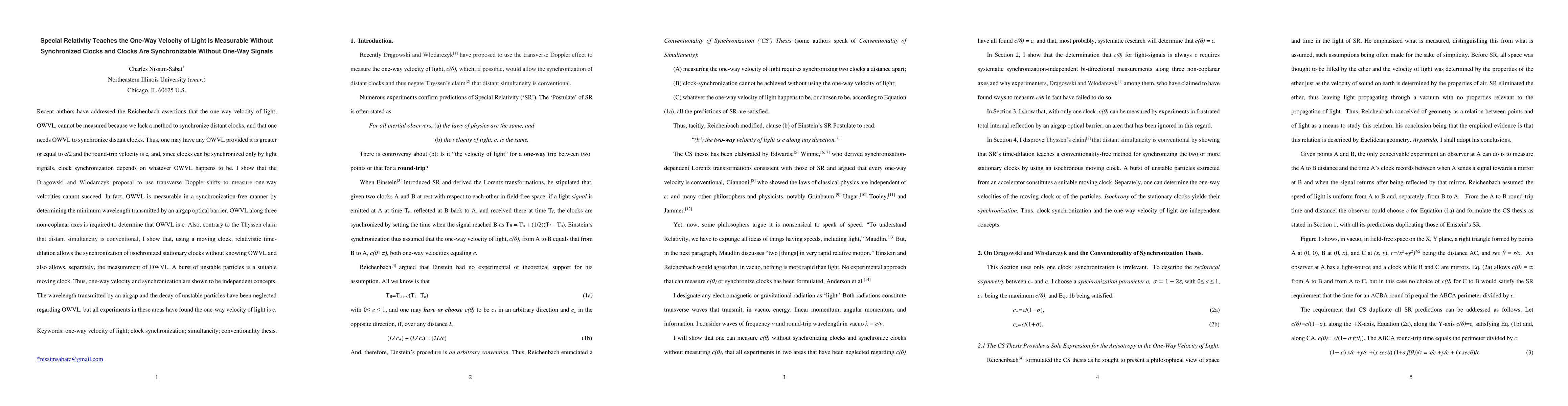 Recent authors have addressed the Reichenbach assertions that the one-way velocity of light, OWVL, cannot be measured because we lack a method to synchronize distant clocks, and that one needs OWVL to synchronize distant clocks. Thus, one may have any OWVL provided it is greater or equal to c/2 and the round-trip velocity is c, and, since clocks can be synchronized only by light signals, clock synchronization depends on whatever OWVL happens to be. I show that the Dragowski and Wlodarczyk proposal to use transverse Doppler shifts to measure one-way velocities cannot succeed. In fact, OWVL is measurable in a synchronization-free manner by determining the minimum wavelength transmitted by an airgap optical barrier. OWVL along three non-coplanar axes is required to determine that OWVL is c. Also, contrary to the Thyssen claim that distant simultaneity is conventional, I show that, using a moving clock, relativistic time-dilation allows the synchronization of isochronized stationary clocks without knowing OWVL and also allows, separately, the measurement of OWVL. A burst of unstable particles is a suitable moving clock. Thus, one-way velocity and synchronization are shown to be independent concepts. The wavelength transmitted by an airgap and the decay of unstable particles have been neglected regarding OWVL, but all experiments in these areas have found the one-way velocity of light is c.