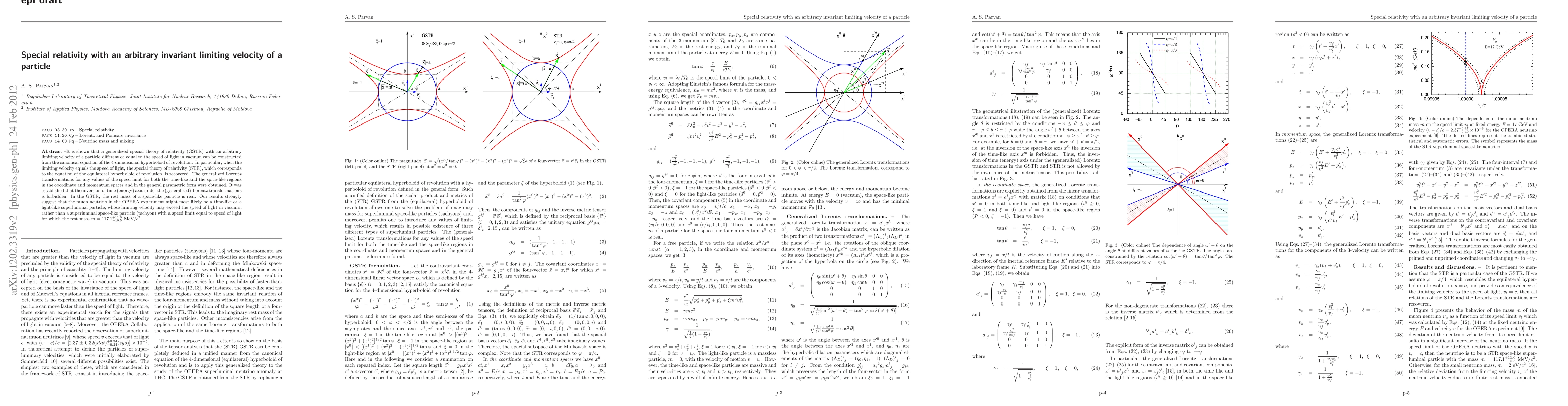 It is shown that a generalized special theory of relativity (GSTR) with an arbitrary limiting velocity of a particle different or equal to the speed of light in vacuum can be constructed from the canonical equation of the 4-dimensional hyperboloid of revolution. In particular, when the limiting velocity equals the speed of light, the special theory of relativity (STR), which corresponds to the equation of the equilateral hyperboloid of revolution, is recovered. The generalized Lorentz transformations for any values of the speed limit for both the time-like and the spice-like regions in the coordinate and momentum spaces and in the general parametric form were obtained. It was established that the inversion of time (energy) axis under the (generalized) Lorentz transformations is forbidden. In the GSTR, the rest mass of a space-like particle is real. Our results strongly suggest that the muon neutrino in the OPERA experiment might most likely be a time-like or a light-like superluminal particle, whose limiting velocity may exceed the speed of light in vacuum, rather than a superluminal space-like particle (tachyon) with a speed limit equal to speed of light for which the rest mass $m=117.1^{+11.0}_{-10.5}$ MeV$/c^{2}$.