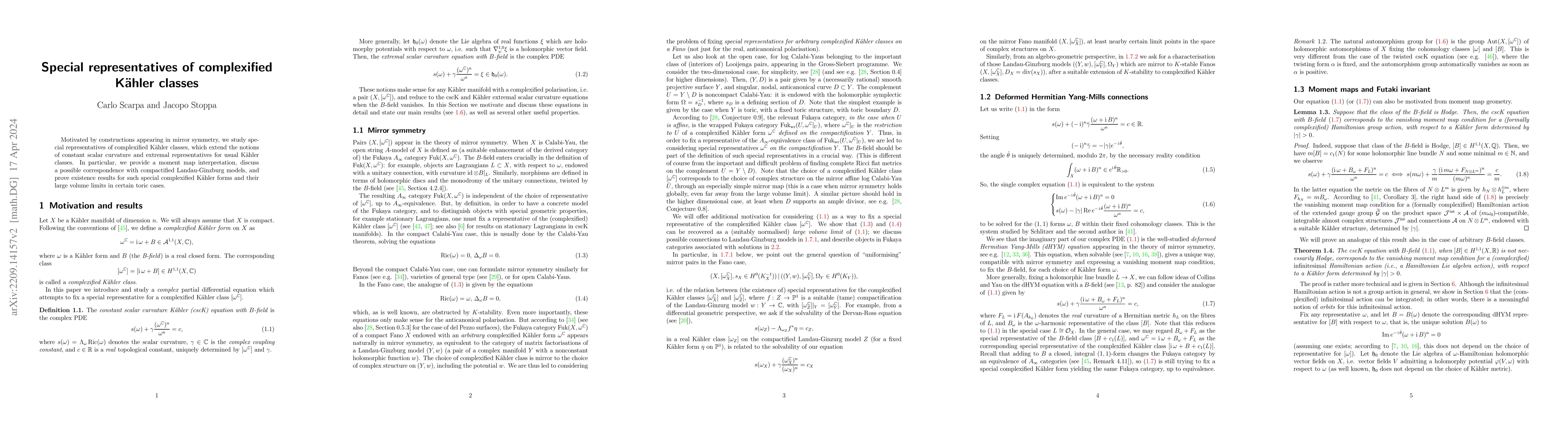 This paper investigates special representatives of complexified Kähler classes, extending the concept of constant scalar curvature and extremal representatives for usual Kähler classes. It provides a moment map interpretation and explores a potential link to compactified Landau-Ginzburg models, while proving the existence of these special forms in specific toric cases.