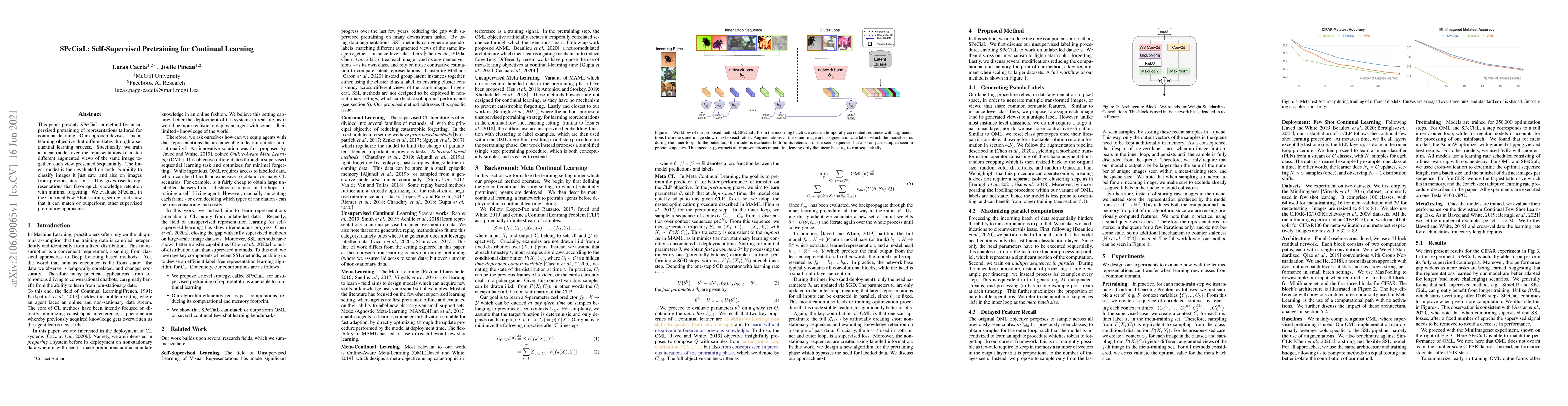 This paper presents SPeCiaL: a method for unsupervised pretraining of representations tailored for continual learning. Our approach devises a meta-learning objective that differentiates through a sequential learning process. Specifically, we train a linear model over the representations to match different augmented views of the same image together, each view presented sequentially. The linear model is then evaluated on both its ability to classify images it just saw, and also on images from previous iterations. This gives rise to representations that favor quick knowledge retention with minimal forgetting. We evaluate SPeCiaL in the Continual Few-Shot Learning setting, and show that it can match or outperform other supervised pretraining approaches.
