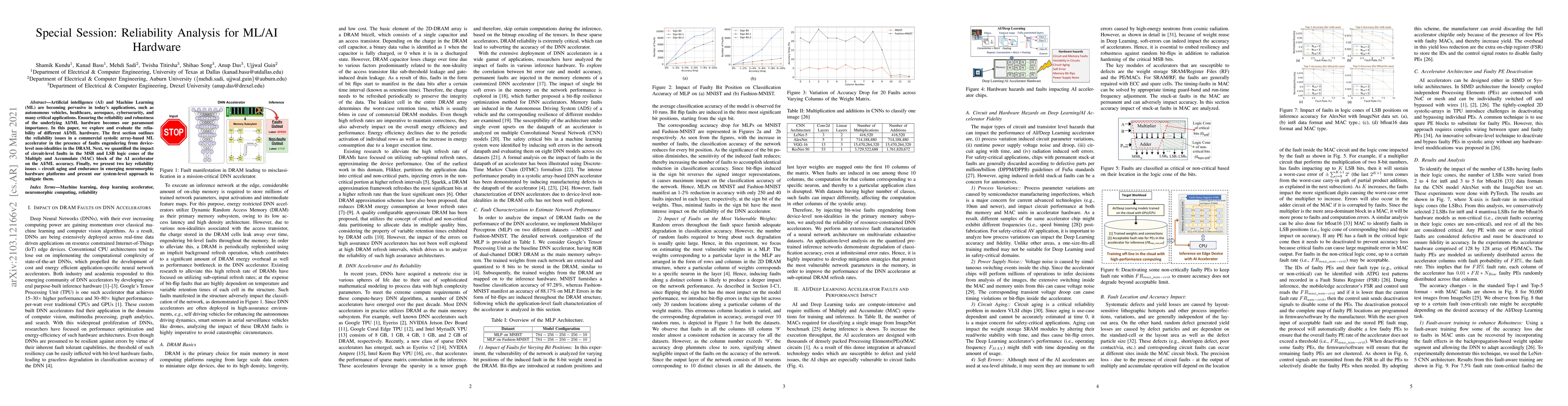 This paper investigates the reliability of AI/ML hardware, focusing on a commercial systolic array-based ML accelerator. It examines the impact of device-level DRAM faults and circuit-level faults in the MAC block, and addresses reliability issues like circuit aging and endurance in neuromorphic hardware.