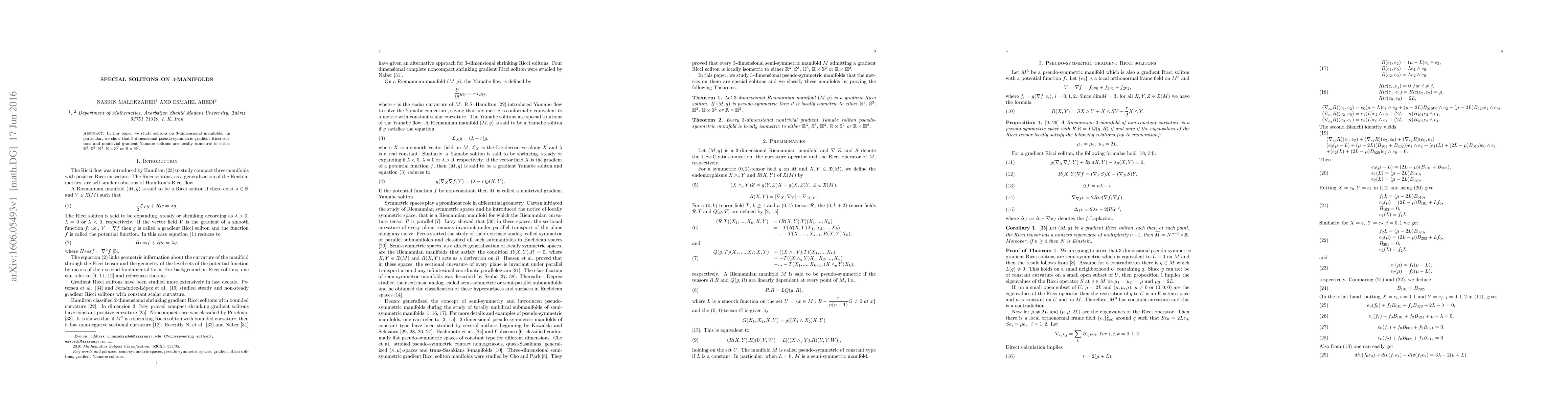 This paper investigates solitons on 3-dimensional manifolds, demonstrating that pseudo-symmetric gradient Ricci solitons and nontrivial gradient Yamabe solitons are locally isometric to $\mathbb{R}^{3}$, $\mathbb{S}^{3}$, $\mathbb{H}^{3}$, $\mathbb{R} \times \mathbb{S}^{2}$, or $\mathbb{R} \times \mathbb{H}^{2}$.