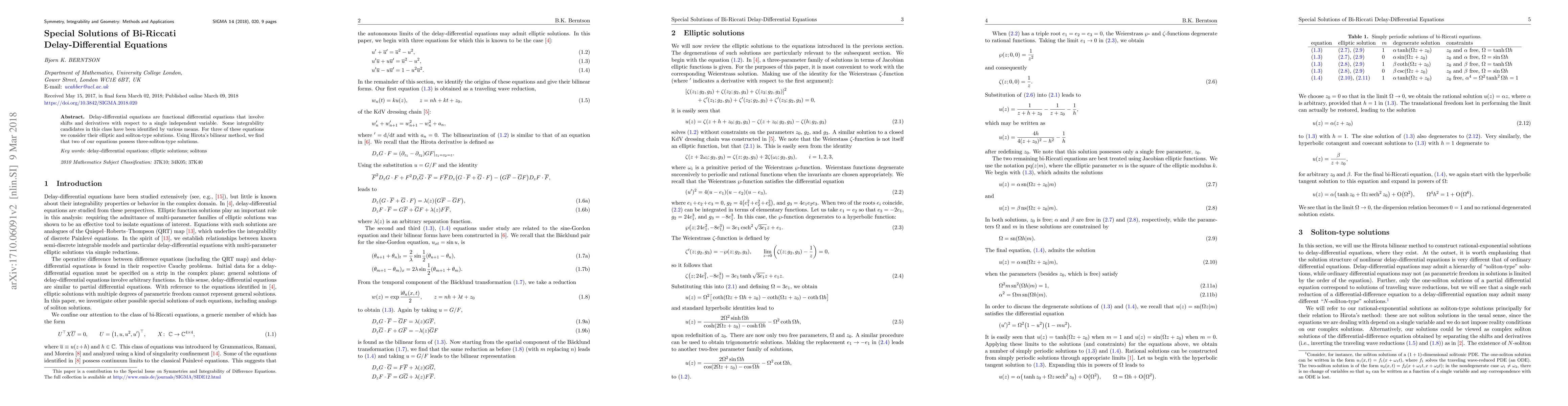 This paper investigates special solutions of bi-Riccati delay-differential equations, focusing on elliptic and soliton-type solutions. Utilizing Hirota's bilinear method, the authors discover three-soliton-type solutions for two of the studied equations.
