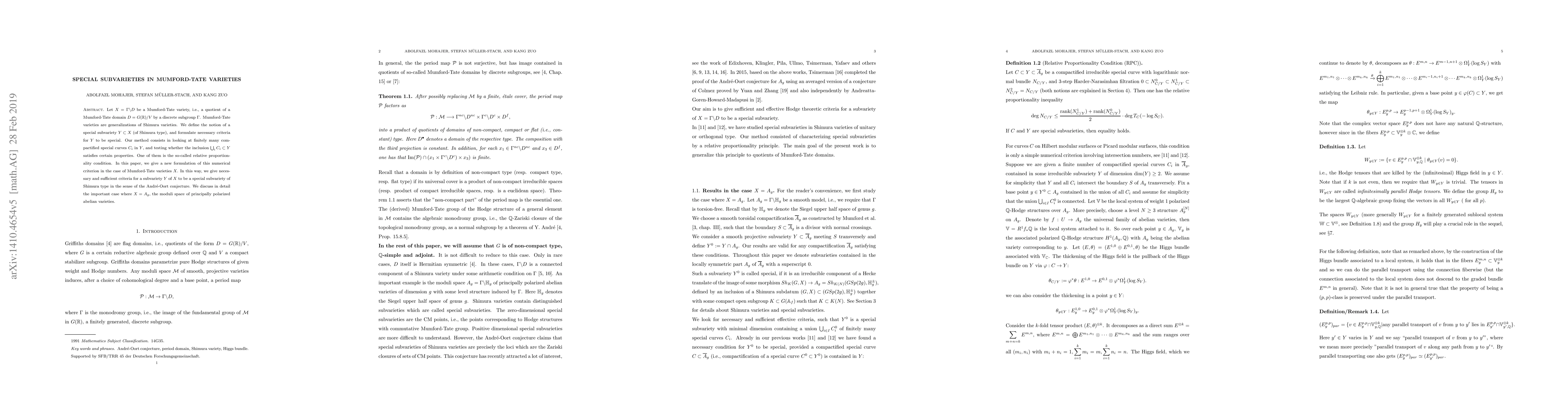 This paper introduces the concept of special subvarieties in Mumford-Tate varieties, providing necessary and sufficient criteria for a subvariety to be special, particularly through the relative proportionality condition. It focuses on the moduli space of principally polarized abelian varieties, A_g, to illustrate these criteria.