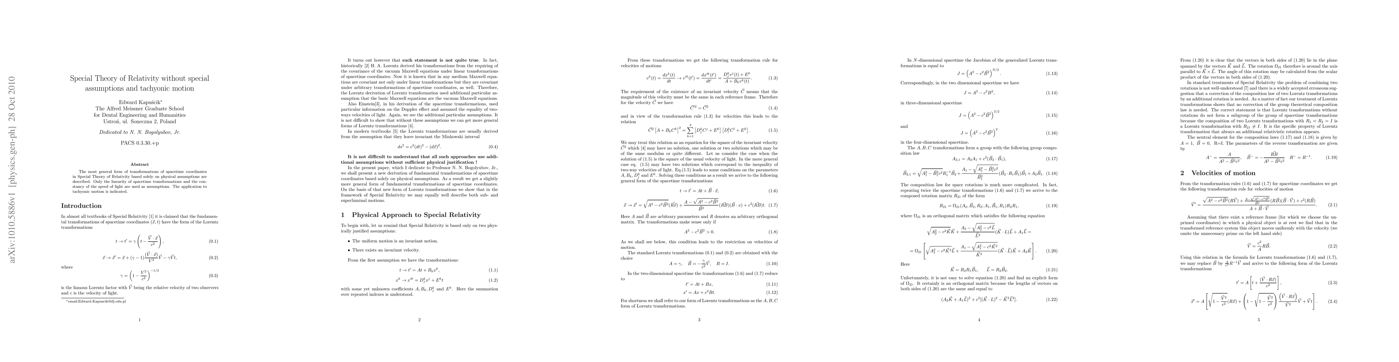 The most general form of transformations of spacetime coordinates in Special Theory of Relativity based solely on physical assumptions are described. Only the linearity of spacetime transformations and the constancy of the speed of light are used as assumptions. The application to tachyonic motion is indicated.