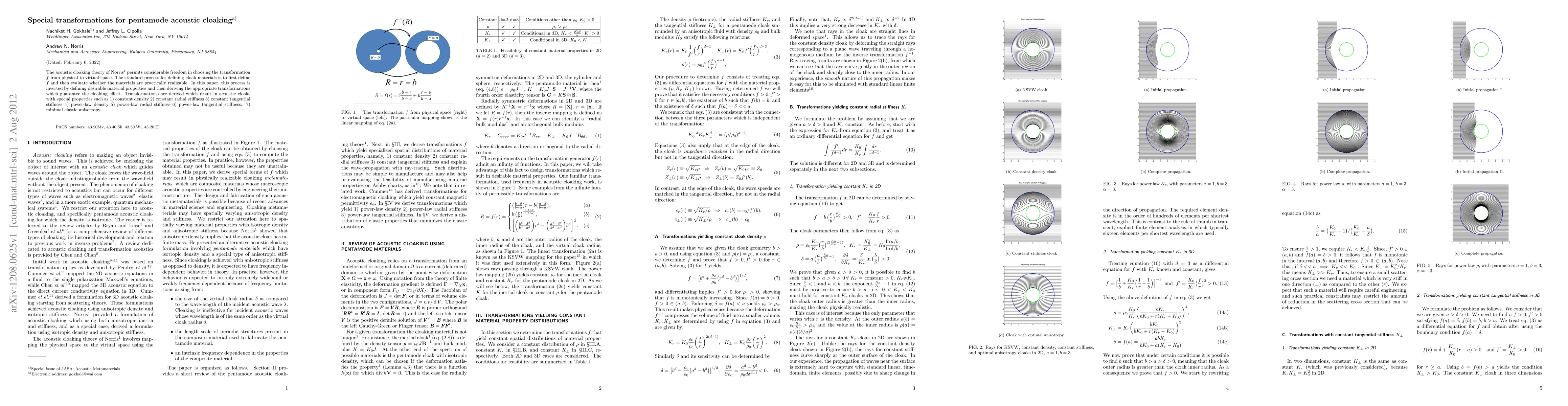 The acoustic cloaking theory of Norris (2008) permits considerable freedom in choosing the transformation function f from physical to virtual space. The standard process for defining cloak materials is to first define f and then evaluate whether the materials are practically realizable. In this paper, this process is inverted by defining desirable material properties and then deriving the appropriate transformations which guarantee the cloaking effect. Transformations are derived which result in acoustic cloaks with special properties such as 1) constant density 2) constant radial stiffness 3) constant tangential stiffness 4) power-law density 5) power-law radial stiffness 6) power-law tangential stiffness 7) minimal elastic anisotropy.