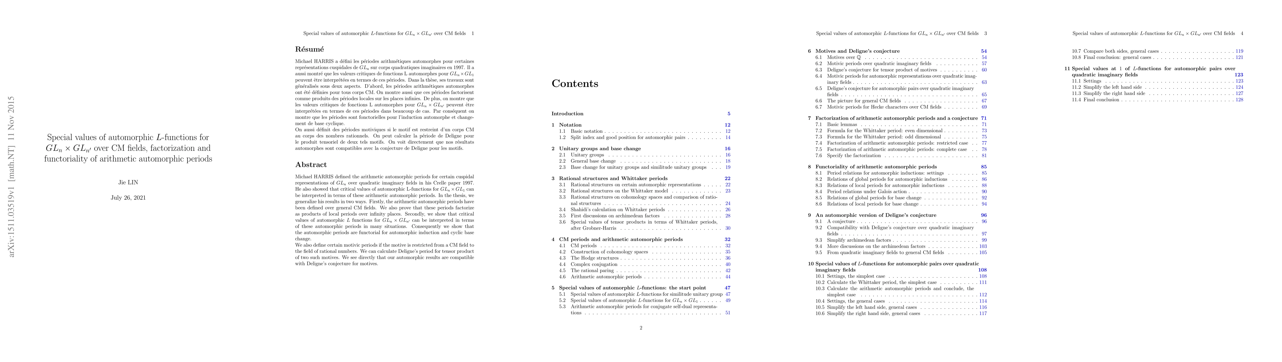 Michael HARRIS defined the arithmetic automorphic periods for certain cuspidal representations of $GL_{n}$ over quadratic imaginary fields in his Crelle paper 1997. He also showed that critical values of automorphic L-functions for $GL_{n}\times GL_{1}$ can be interpreted in terms of these arithmetic automorphic periods. In the thesis, we generalize his results in two ways. Firstly, the arithmetic automorphic periods have been defined over general CM fields. We also prove that these periods factorize as products of local periods over infinity places. Secondly, we show that critical values of automorphic $L$ functions for $GL_{n}\times GL_{n'}$ can be interpreted in terms of these automorphic periods in many situations. Consequently we show that the automorphic periods are functorial for automorphic induction and cyclic base change. We also define certain motivic periods if the motive is restricted from a CM field to the field of rational numbers. We can calculate Deligne's period for tensor product of two such motives. We see directly that our automorphic results are compatible with Deligne's conjecture for motives.