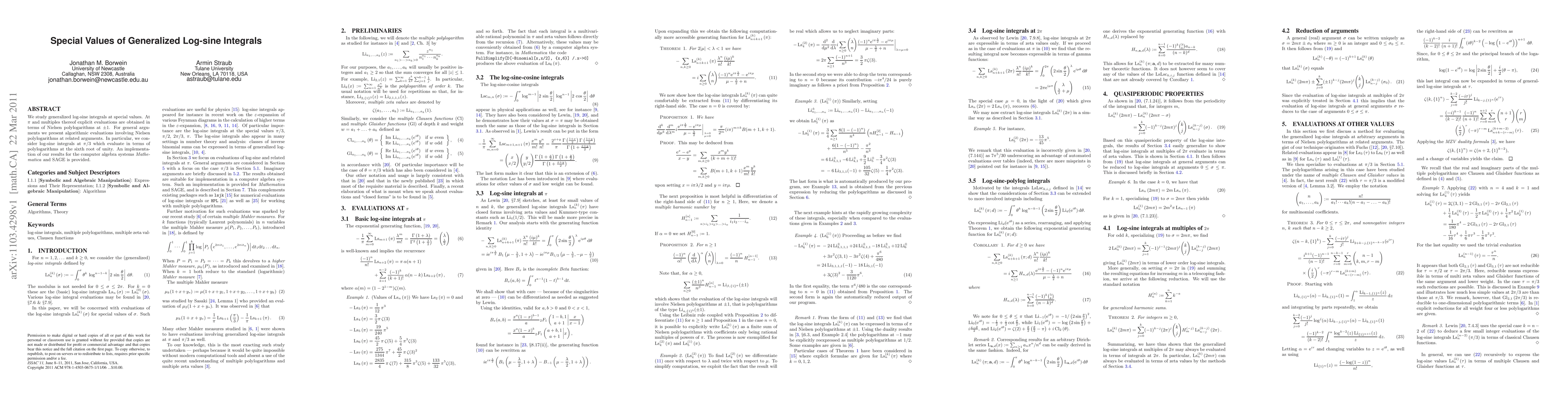 This paper evaluates generalized log-sine integrals at special values, notably $\pi$ and its multiples, in terms of Nielsen polylogarithms at $\pm1$, and provides algorithmic evaluations for other arguments. It also details specific evaluations for $\pi/3$ in terms of polylogarithms at the sixth root of unity, with implementations for Mathematica and SAGE.