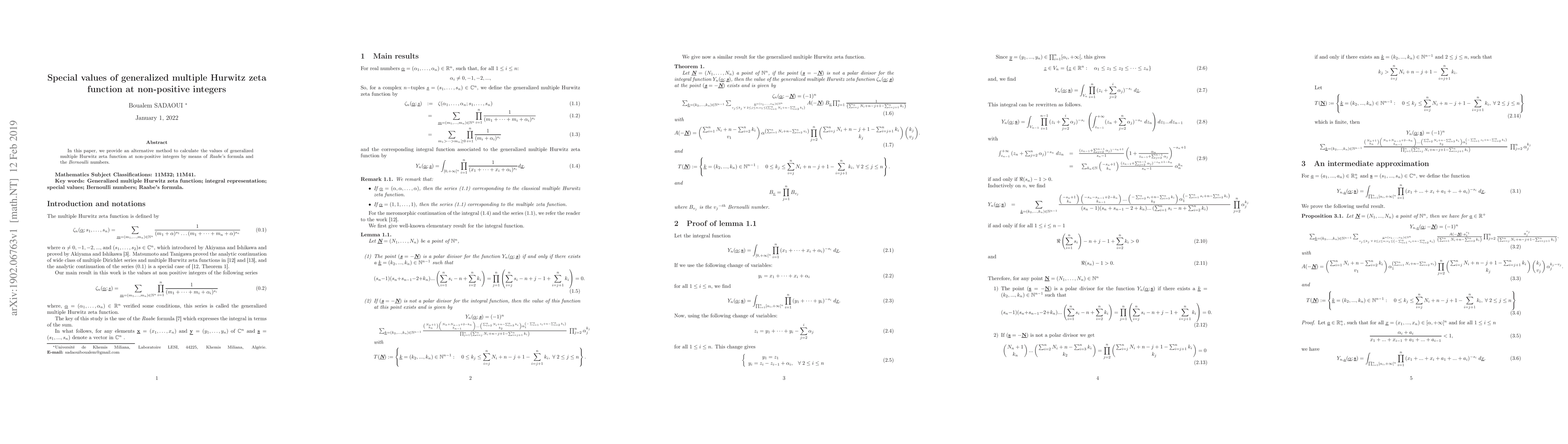 Summary: This paper introduces an alternative method to compute values of the generalized multiple Hurwitz zeta function at non-positive integers using Raabe's formula and Bernoulli numbers. The approach provides new insights into these special values.