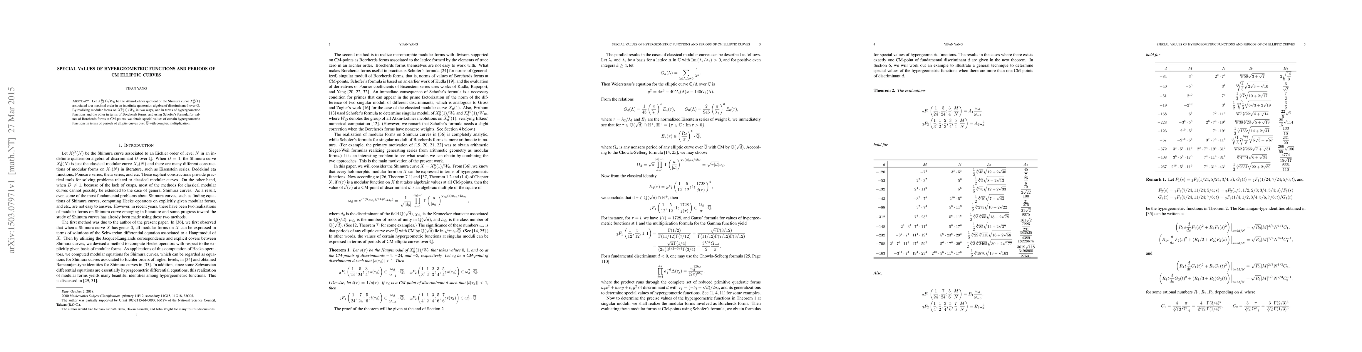This research connects special values of hypergeometric functions to periods of elliptic curves with complex multiplication (CM) by analyzing the Atkin-Lehner quotient of a Shimura curve, utilizing both hypergeometric and Borcherds forms.