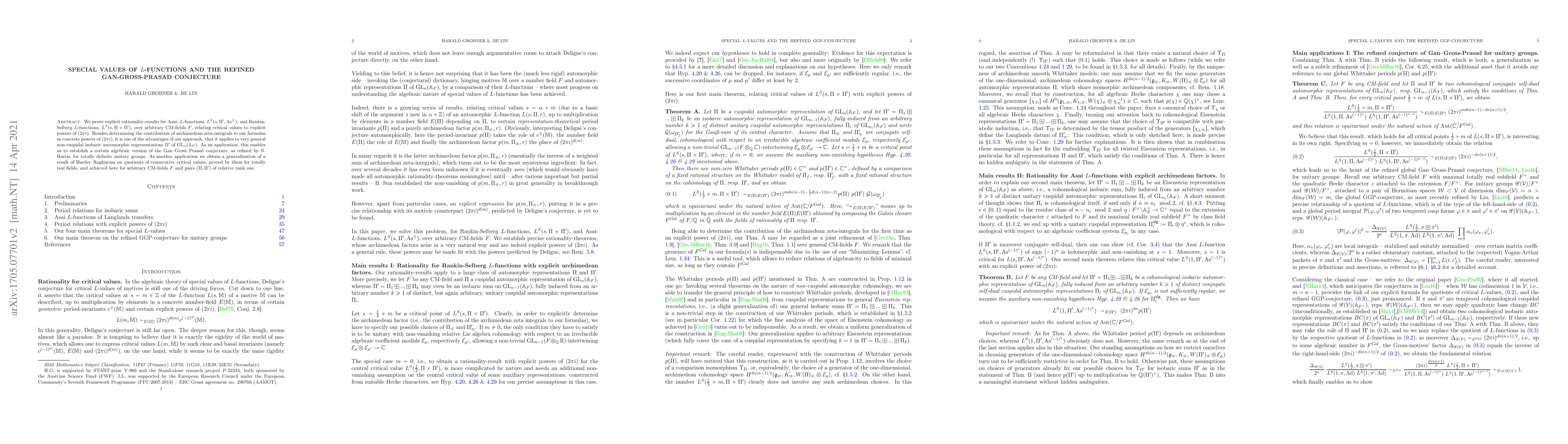 We prove explicit rationality-results for Asai- $L$-functions, $L^S(s,\Pi',{\rm As}^\pm)$, and Rankin-Selberg $L$-functions, $L^S(s,\Pi\times\Pi')$, over arbitrary CM-fields $F$, relating critical values to explicit powers of $(2\pi i)$. Besides determining the contribution of archimedean zeta-integrals to our formulas as concrete powers of $(2\pi i)$, it is one of the advantages of our approach, that it applies to very general non-cuspidal isobaric automorphic representations $\Pi'$ of ${\rm GL}_n(\mathbb A_F)$. As an application, this enables us to establish a certain algebraic version of the Gan--Gross--Prasad conjecture, as refined by N.\ Harris, for totally definite unitary groups. As another application we obtain a generalization of a result of Harder--Raghuram on quotients of consecutive critical values, proved by them for totally real fields, and achieved here for arbitrary CM-fields $F$ and pairs $(\Pi,\Pi')$ of relative rank one.