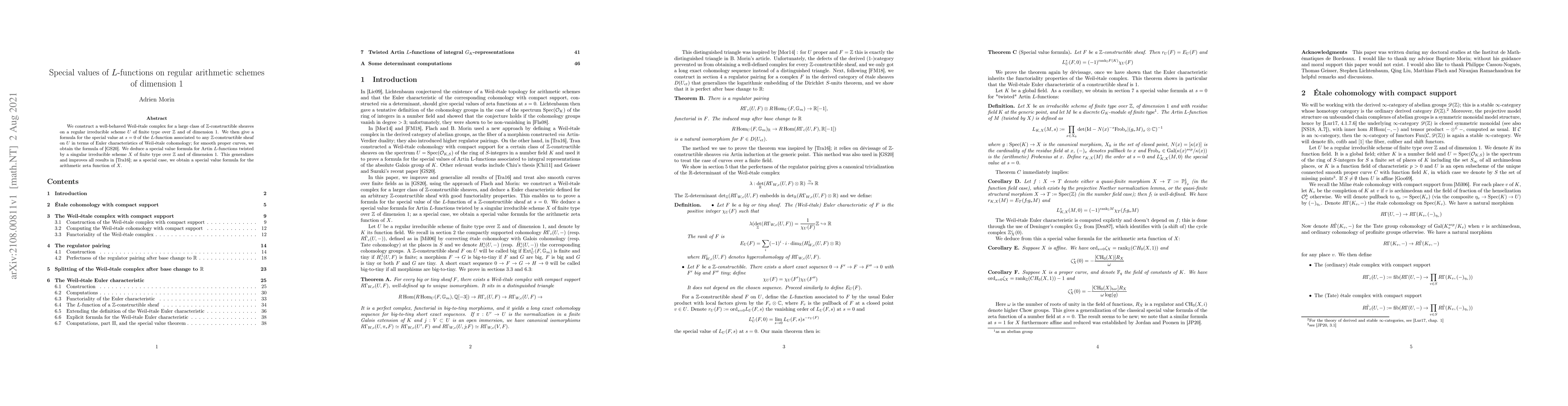 This paper constructs a Weil-étale complex for $\mathbb{Z}$-constructible sheaves on 1-dimensional schemes over $\mathbb{Z}$ and provides a formula for the $L$-function special value at $s=0$ in terms of Weil-étale cohomology Euler characteristics. It also generalizes special value formulas for Artin $L$-functions and arithmetic zeta functions.
