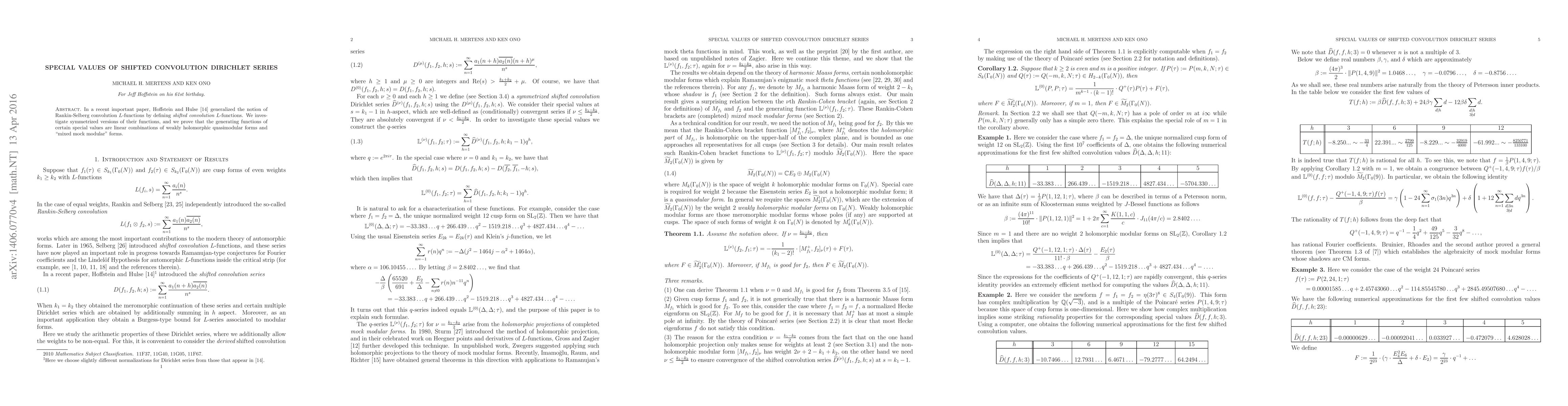 In a recent important paper, Hoffstein and Hulse generalized the notion of Rankin-Selberg convolution $L$-functions by defining shifted convolution $L$-functions. We investigate symmetrized versions of their functions. Under certain mild conditions, we prove that the generating functions of certain special values are linear combinations of weakly holomorphic quasimodular forms and "mixed mock modular" forms.