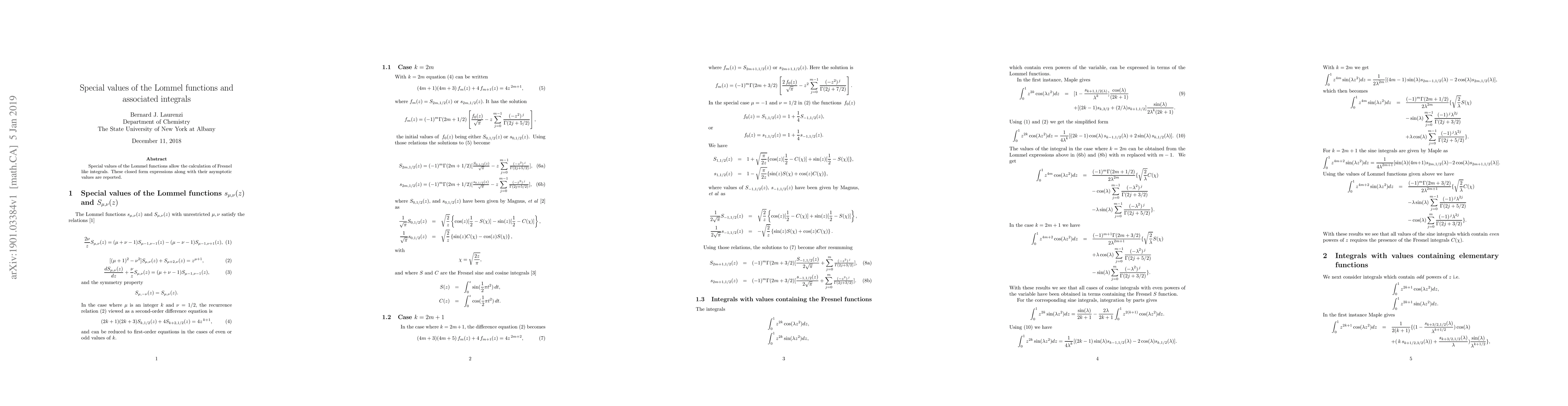 Special values of the Lommel functions allow the calculation of Fresnel like integrals. These closed form expressions along with their asymptotic values are reported.