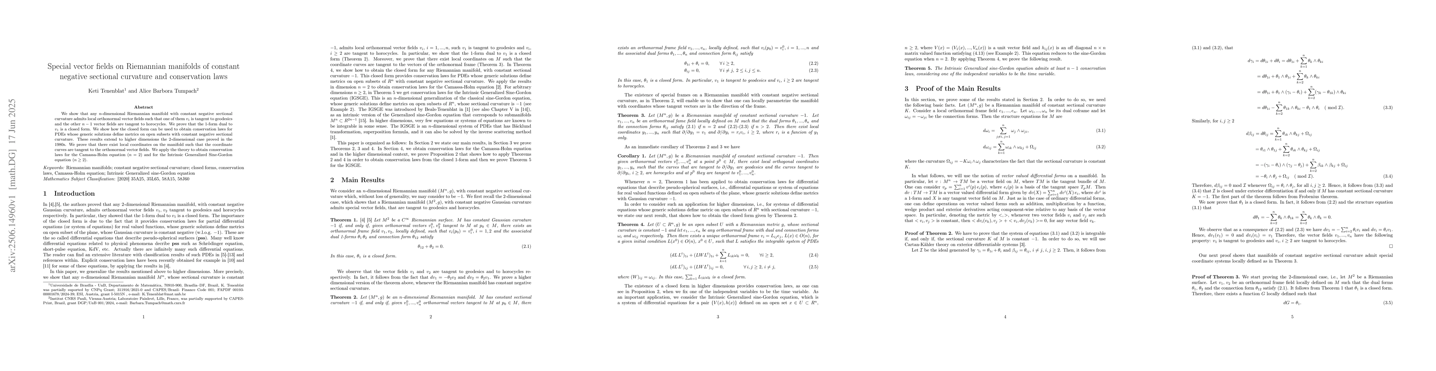 We show that any $n$-dimensional Riemannian manifold with constant negative sectional curvature admits local orthonormal vector fields such that one of them $v_1$ is tangent to geodesics and the other $n-1$ vector fields are tangent to horocycles. We prove that the $1$-form dual to $v_1$ is a closed form. We show how the closed form can be used to obtain conservation laws for PDEs whose generic solutions define metrics on open subsets with constant negative sectional curvature. These results extend to higher dimensions the $2$-dimensional case proved in the 1980s. We prove that there exist local coordinates on the manifold such that the coordinate curves are tangent to the orthonormal vector fields. We apply the theory to obtain conservation laws for the Camassa-Holm equation ($n=2$) and for the Intrinsic Generalized Sine-Gordon equation ($n\geq 2$).