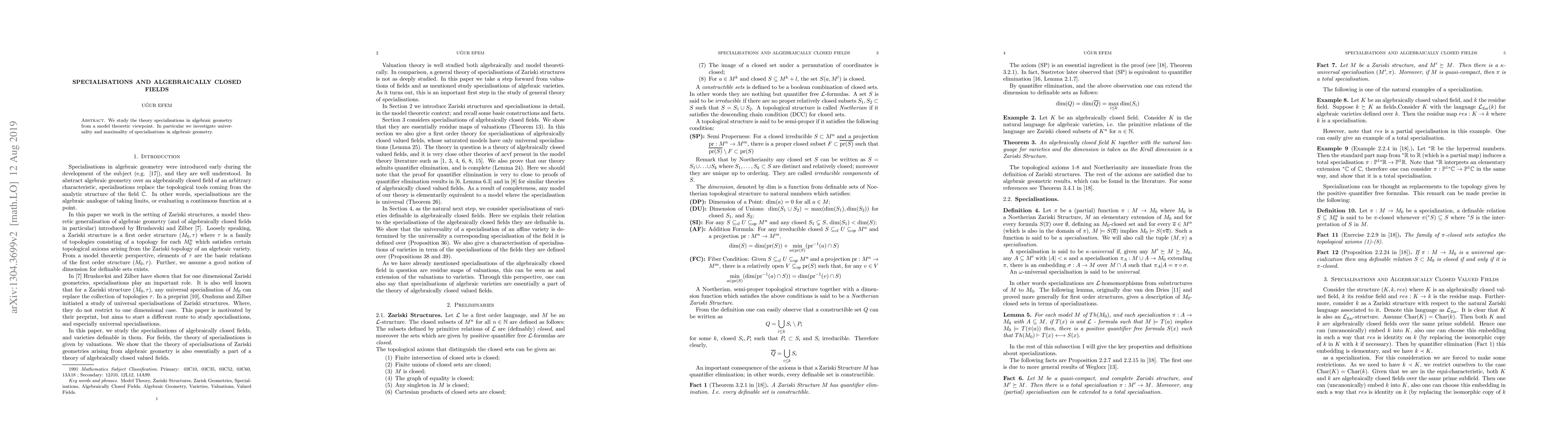 This paper explores the model theory of specialisations in algebraic geometry, focusing on the universality and maximality of these specialisations within algebraically closed fields. It aims to understand how these concepts interact in the broader context of algebraic geometry.