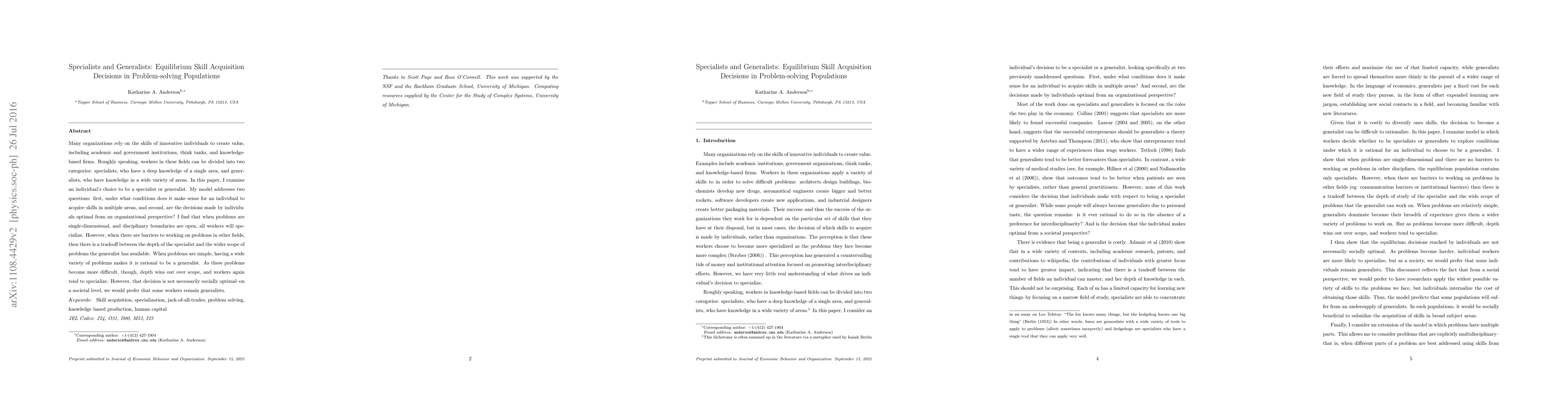 The paper introduces a theoretical framework to analyze the equilibrium skill acquisition decisions in problem-solving populations, identifying conditions under which specialization or generalization is optimal.
