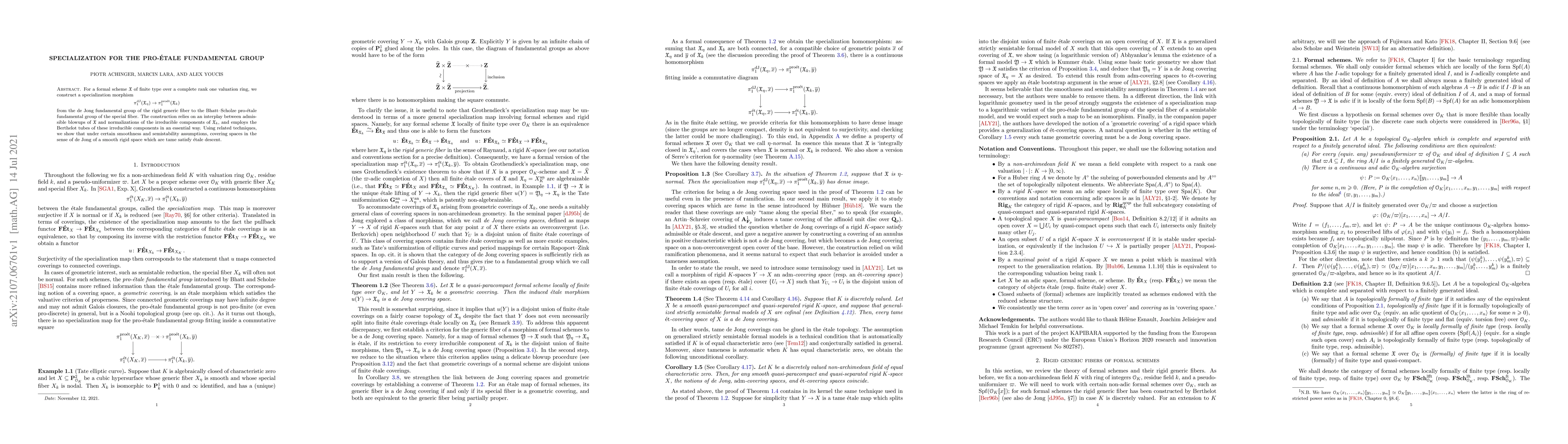 The paper introduces a specialization morphism between the de Jong and pro-'etale fundamental groups, leveraging admissible blowups and normalizations.
