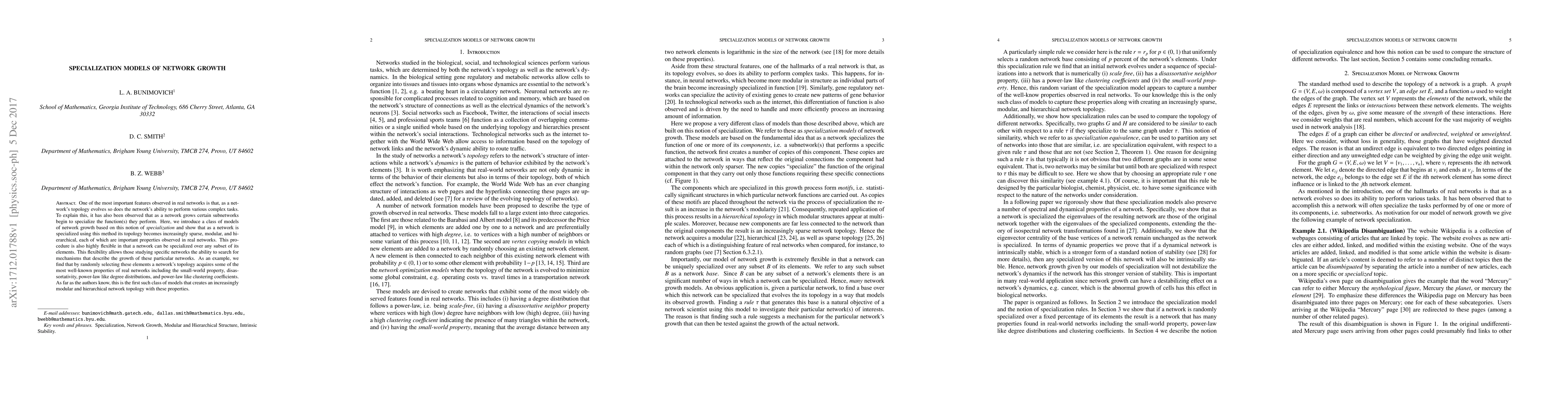 One of the most important features observed in real networks is that, as a network's topology evolves so does the network's ability to perform various complex tasks. To explain this, it has also been observed that as a network grows certain subnetworks begin to specialize the function(s) they perform. Here, we introduce a class of models of network growth based on this notion of specialization and show that as a network is specialized using this method its topology becomes increasingly sparse, modular, and hierarchical, each of which are important properties observed in real networks. This procedure is also highly flexible in that a network can be specialized over any subset of its elements. This flexibility allows those studying specific networks the ability to search for mechanisms that describe the growth of these particular networks. As an example, we find that by randomly selecting these elements a network's topology acquires some of the most well-known properties of real networks including the small-world property, disassortativity, power-law like degree distributions, and power-law like clustering coefficients. As far as the authors know, this is the first such class of models that creates an increasingly modular and hierarchical network topology with these properties.