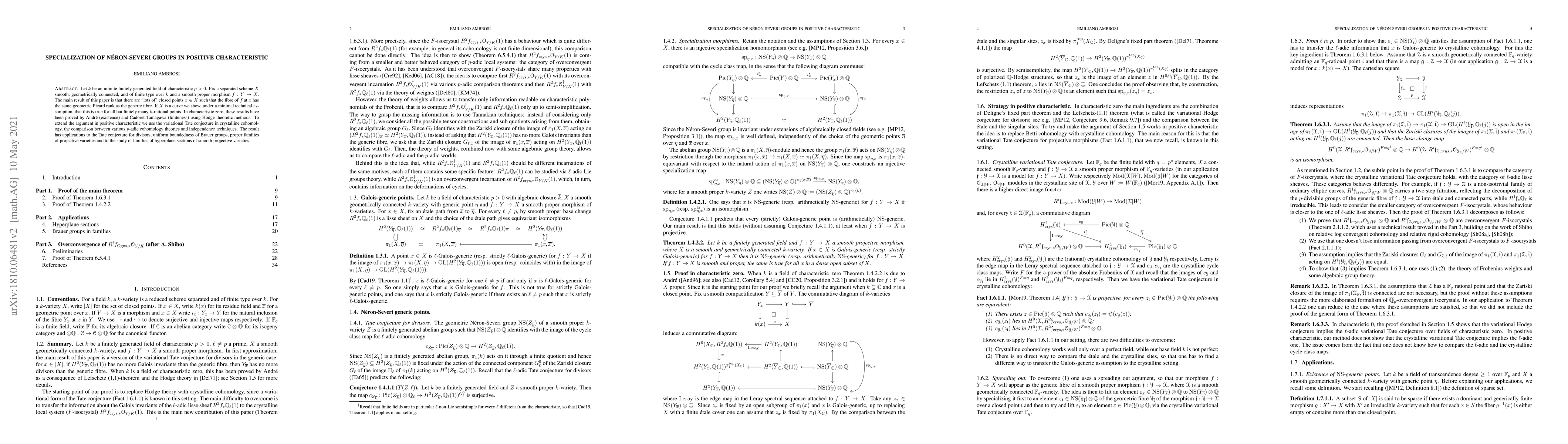 Let $k$ be an infinite finitely generated field of characteristic $p>0$. Fix a separated scheme $X$ smooth, geometrically connected, and of finite type over $k$ and a smooth proper morphism $f:Y\rightarrow X$. The main result of this paper is that there are ``lots of" closed points $x\in X$ such that the fibre of $f$ at $x$ has the same geometric Picard rank as the generic fibre. If $X$ is a curve we show, under a minimal technical assumption, that this is true for all but finitely many $k$-rational points. In characteristic zero, these results have been proved by Andr\'e (existence) and Cadoret-Tamagawa (finiteness) using Hodge theoretic methods. To extend the argument in positive characteristic we use the variational Tate conjecture in crystalline cohomology, the comparison between various $p$-adic cohomology theories and independence techniques. The result has applications to the Tate conjecture for divisors, uniform boundedness of Brauer groups, proper families of projective varieties and to the study of families of hyperplane sections of smooth projective varieties.