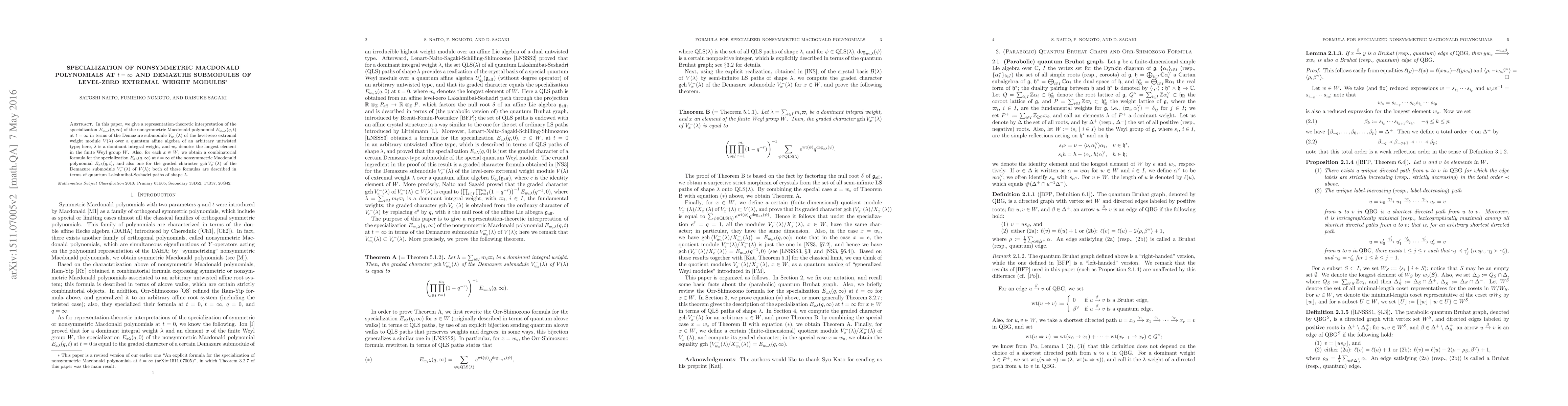 In this paper, we give a representation-theoretic interpretation of the specialization $E_{w_{\circ} \lambda} (q,\infty)$ of the nonsymmetric Macdonald polynomial $E_{w_{\circ} \lambda}(q,t)$ at $t=\infty$ in terms of the Demazure submodule $V_{w_\circ}^{-} (\lambda)$ of the level-zero extremal weight module $V(\lambda)$ over a quantum affine algebra of an arbitrary untwisted type, here, $\lambda$ is a dominant integral weight, and $w_{\circ}$ denotes the longest element in the finite Weyl group $W$. Also, for each $x \in W$, we obtain a combinatorial formula for the specialization $E_{x \lambda} (q, \infty)$ at $t=\infty$ of the nonsymmetric Macdonald polynomial $E_{x \lambda} (q,t)$, and also one for the graded character $\mathrm{gch} V_{x}^- (\lambda)$ of the Demazure submodule $V_{x}^- (\lambda)$ of $V(\lambda)$, both of these formulas are described in terms of quantum Lakshmibai-Seshadri paths of shape $\lambda$.