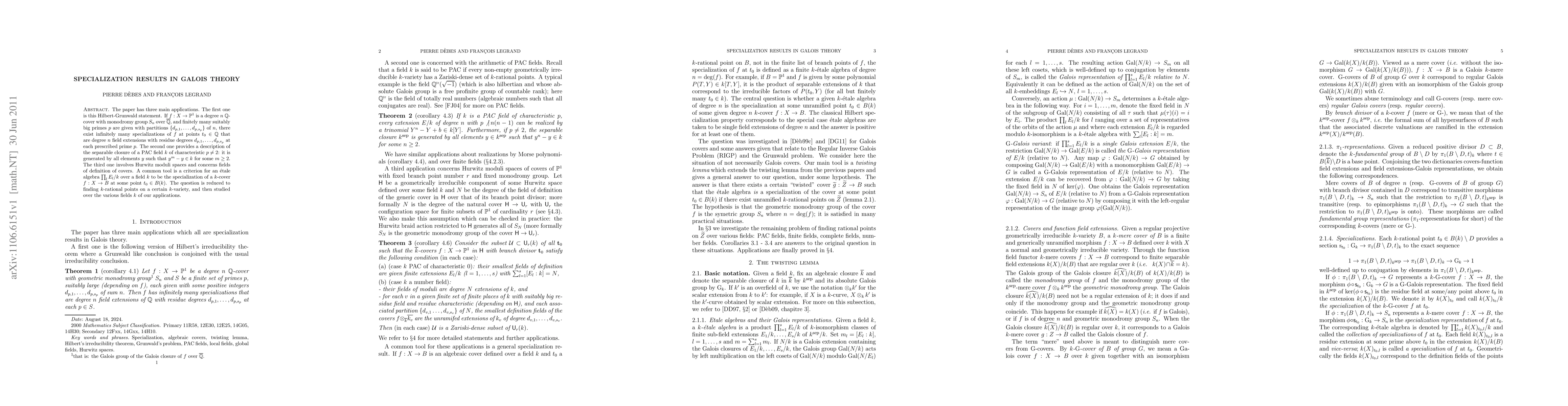 This paper explores specialization in Galois theory, demonstrating three main applications: (1) the Hilbert-Grunwald statement for degree $n$ covers, (2) the separable closure of PAC fields, and (3) Hurwitz moduli spaces concerning covers' fields of definition. A key criterion is developed for determining if an étale algebra is a specialization of a given cover.
