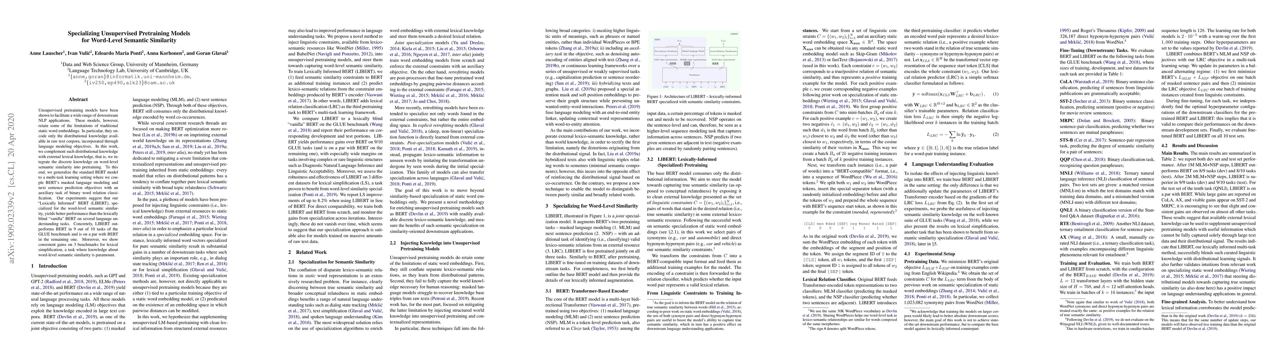 This paper proposes a specialized version of BERT, called "Lexically Informed" BERT (LIBERT), which integrates external lexical knowledge for word-level semantic similarity through multi-task learning. LIBERT outperforms the standard BERT on most GLUE benchmark tasks and shows consistent gains in lexical simplification tasks.