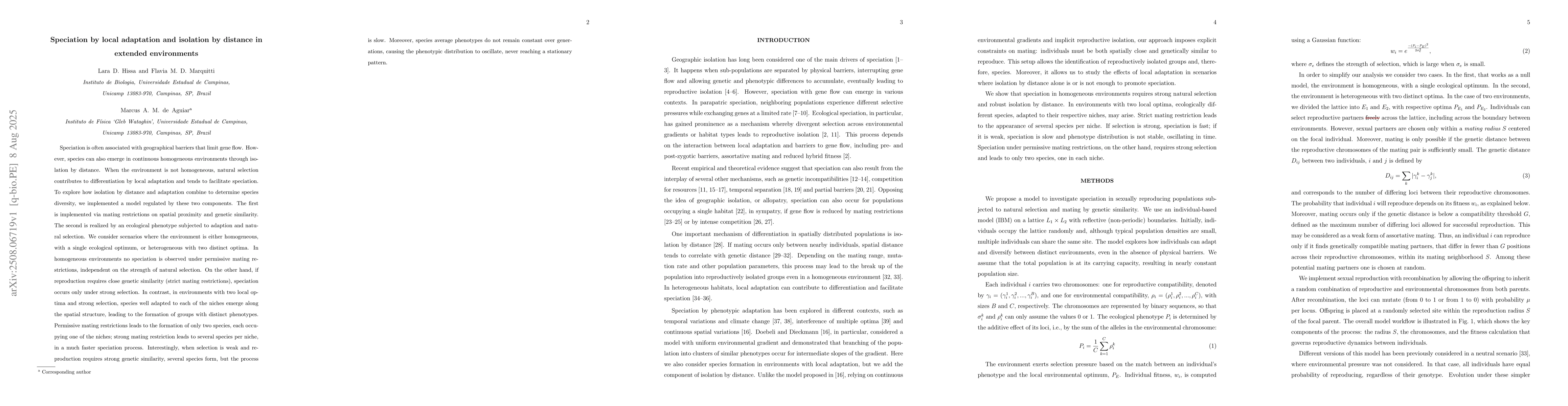 Speciation is often associated with geographical barriers that limit gene flow. However, species can also emerge in continuous homogeneous environments through isolation by distance. When the environment is not homogeneous, natural selection contributes to differentiation by local adaptation and tends to facilitate speciation. To explore how isolation by distance and adaptation combine to determine species diversity, we implemented a model regulated by these two components. The first is implemented via mating restrictions on spatial proximity and genetic similarity. The second is realized by an ecological phenotype subjected to adaption and natural selection. We consider scenarios where the environment is either homogeneous, with a single ecological optimum, or heterogeneous with two distinct optima. In homogeneous environments no speciation is observed under permissive mating restrictions, independent on the strength of natural selection. On the other hand, if reproduction requires close genetic similarity (strict mating restrictions), speciation occurs only under strong selection. In contrast, in environments with two local optima and strong selection, species well adapted to each of the niches emerge along the spatial structure, leading to the formation of groups with distinct phenotypes. Permissive mating restrictions leads to the formation of only two species, each occupying one of the niches; strong mating restriction leads to several species per niche, in a much faster speciation process. Interestingly, when selection is weak and reproduction requires strong genetic similarity, several species form, but the process is slow. Moreover, species average phenotypes do not remain constant over generations, causing the phenotypic distribution to oscillate, never reaching a stationary pattern.