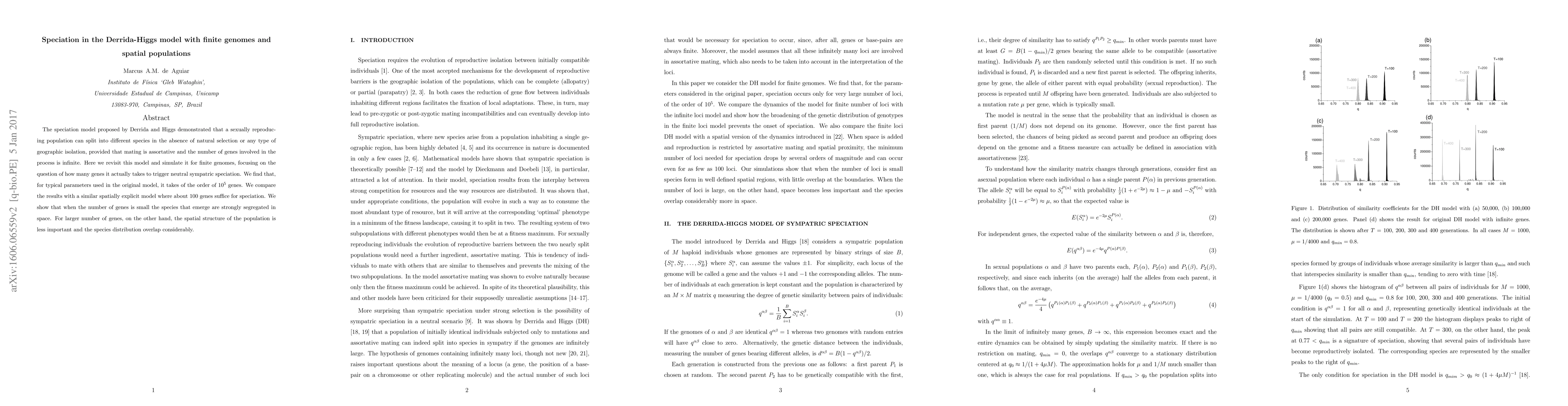 This paper revisits the Derrida-Higgs speciation model with finite genomes, finding that around $10^5$ genes are needed for neutral sympatric speciation under typical parameters. It contrasts this with a spatially explicit model where only 100 genes suffice, showing that smaller gene numbers lead to strongly segregated spatial species, while larger numbers result in overlapping species distributions.