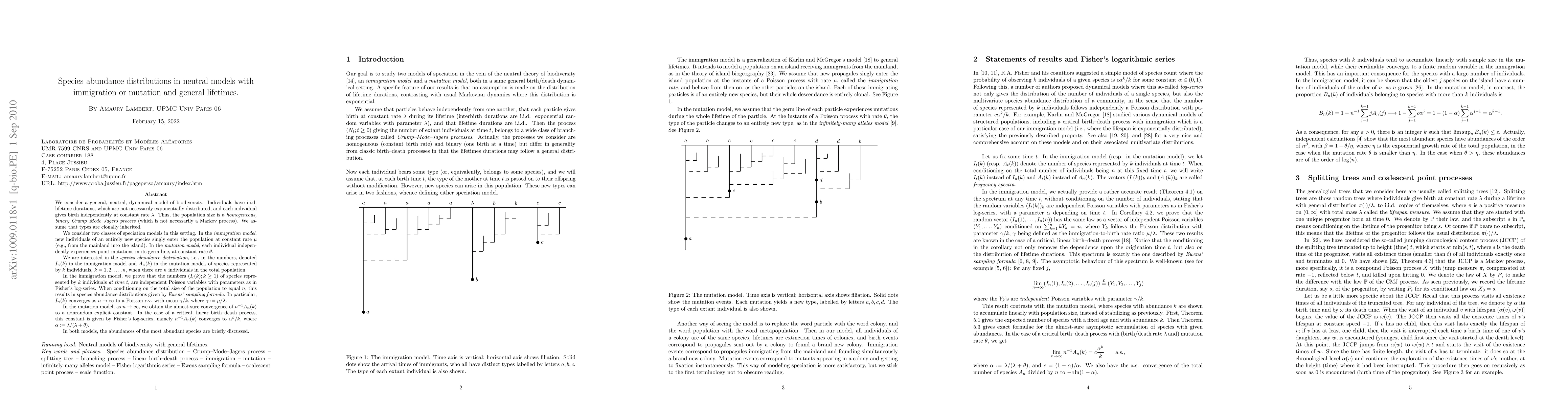 We consider a general, neutral, dynamical model of biodiversity. Individuals have i.i.d. lifetime durations, which are not necessarily exponentially distributed, and each individual gives birth independently at constant rate \lambda. We assume that types are clonally inherited. We consider two classes of speciation models in this setting. In the immigration model, new individuals of an entirely new species singly enter the population at constant rate \mu (e.g., from the mainland into the island). In the mutation model, each individual independently experiences point mutations in its germ line, at constant rate \theta. We are interested in the species abundance distribution, i.e., in the numbers, denoted I_n(k) in the immigration model and A_n(k) in the mutation model, of species represented by k individuals, k=1,2,...,n, when there are n individuals in the total population. In the immigration model, we prove that the numbers (I_t(k);k\ge 1) of species represented by k individuals at time t, are independent Poisson variables with parameters as in Fisher's log-series. When conditioning on the total size of the population to equal n, this results in species abundance distributions given by Ewens' sampling formula. In particular, I_n(k) converges as n\to\infty to a Poisson r.v. with mean \gamma /k, where \gamma:=\mu/\lambda. In the mutation model, as n\to\infty, we obtain the almost sure convergence of n^{-1}A_n(k) to a nonrandom explicit constant. In the case of a critical, linear birth--death process, this constant is given by Fisher's log-series, namely n^{-1}A_n(k) converges to \alpha^{k}/k, where \alpha :=\lambda/(\lambda+\theta). In both models, the abundances of the most abundant species are briefly discussed.
