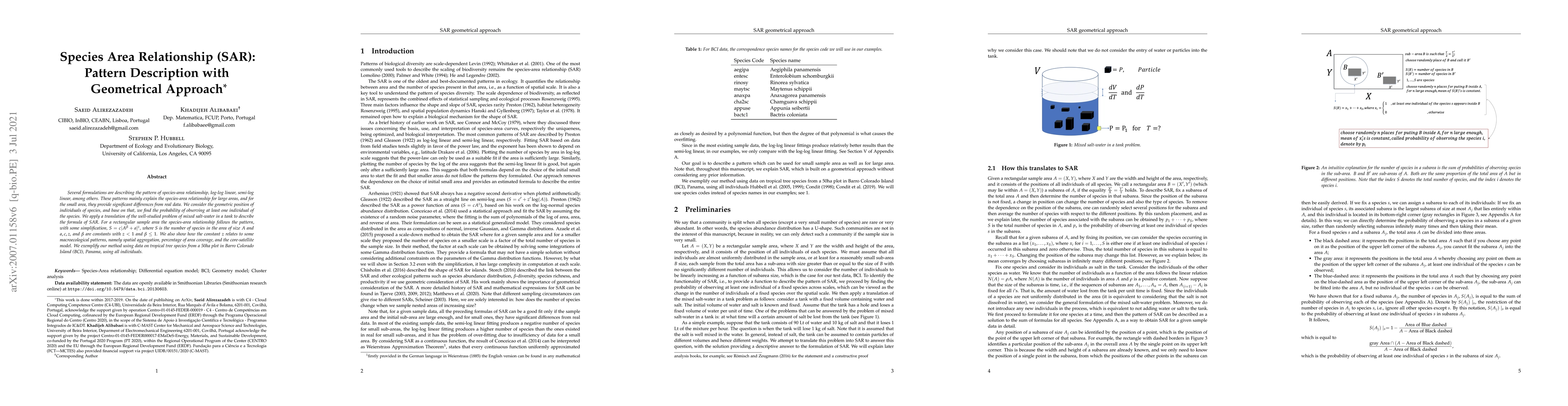 Several formulations are describing the pattern of species-area relationship, log-log linear, semi-log linear, among others. These patterns mainly explain the species-area relationship for large areas, and for the small area, they provide significant differences from real data. We consider the geometric position of individuals of species, and base on that, we find the probability of observing at least one individual of the species. We apply a translation of the well-studied problem of mixed salt-water in a tank to describe the formula of SAR. For a rectangular sample area the species-area relationship follows the pattern, with some simplification, $S=c|A^{\beta}+a|^z$, where $S$ is the number of species in the area of size $A$ and $a,c,z$, and $\beta$ are constants with $z<1$ and $\beta\leq1$. We also show how the constant $z$ relates to some macroecological patterns, namely spatial aggregation, percentage of area coverage, and the core-satellite model. We exemplify our method using data on tropical tree species from a 50ha plot in Barro Colorado Island (BCI), Panama, using all individuals.