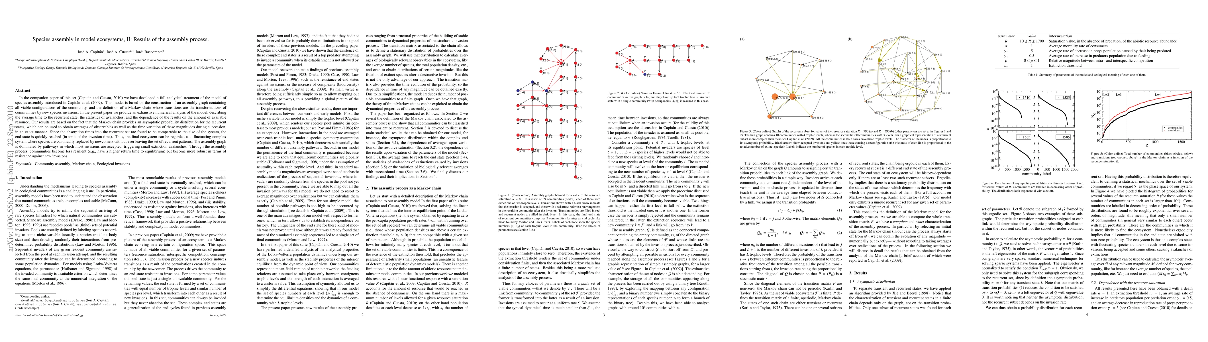 In the companion paper of this set (Capitan and Cuesta, 2010) we have developed a full analytical treatment of the model of species assembly introduced in Capitan et al. (2009). This model is based on the construction of an assembly graph containing all viable configurations of the community, and the definition of a Markov chain whose transitions are the transformations of communities by new species invasions. In the present paper we provide an exhaustive numerical analysis of the model, describing the average time to the recurrent state, the statistics of avalanches, and the dependence of the results on the amount of available resource. Our results are based on the fact that the Markov chain provides an asymptotic probability distribution for the recurrent states, which can be used to obtain averages of observables as well as the time variation of these magnitudes during succession, in an exact manner. Since the absorption times into the recurrent set are found to be comparable to the size of the system, the end state is quickly reached (in units of the invasion time). Thus, the final ecosystem can be regarded as a fluctuating complex system where species are continually replaced by newcomers without ever leaving the set of recurrent patterns. The assembly graph is dominated by pathways in which most invasions are accepted, triggering small extinction avalanches. Through the assembly process, communities become less resilient (e.g., have a higher return time to equilibrium) but become more robust in terms of resistance against new invasions.