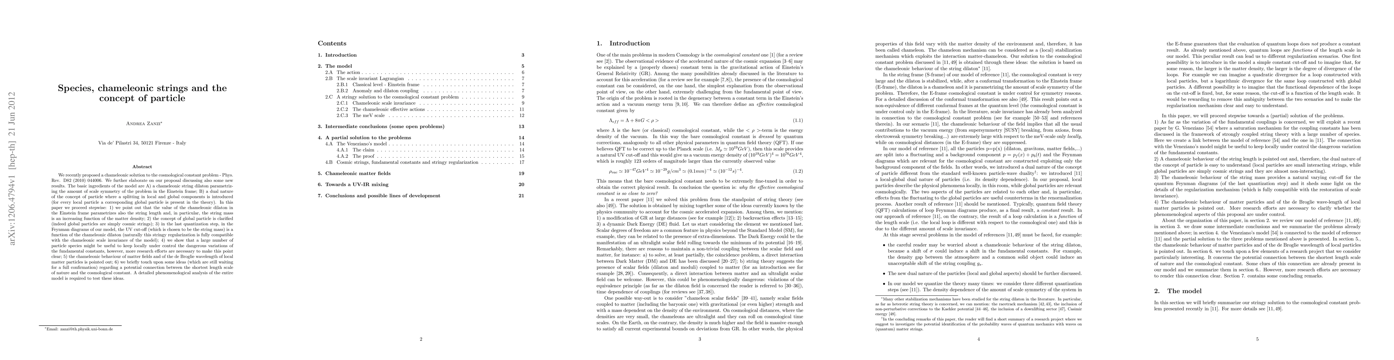 We recently proposed a chameleonic solution to the cosmological constant problem - Phys. Rev. D82 (2010) 044006. We further elaborate on our proposal discussing also some new results. The basic ingredients of the model are A) a chameleonic string dilaton parametrizing the amount of scale symmetry of the problem in the Einstein frame; B) a dual nature of the concept of particle where a splitting in local and global components is introduced (for every local particle a corresponding global particle is present in the theory). In this paper we proceed stepwise: 1) we point out that the value of the chameleonic dilaton in the Einstein frame parametrizes also the string length and, in particular, the string mass is an increasing function of the matter density; 2) the concept of global particle is clarified (indeed global particles are simply cosmic strings); 3) in the last quantization step, in the Feynman diagrams of our model, the UV cut-off (which is chosen to be the string mass) is a function of the chameleonic dilaton (naturally this stringy regularization is fully compatible with the chameleonic scale invariance of the model); 4) we show that a large number of particle species might be useful to keep locally under control the dangerous variations of the fundamental constants, however, more research efforts are necessary to make this point clear; 5) the chameleonic behaviour of matter fields and of the de Broglie wavelength of local matter particles is pointed out; 6) we briefly touch upon some ideas (which are still waiting for a full confirmation) regarding a potential connection between the shortest length scale of nature and the cosmological constant. A detailed phenomenological analysis of the entire model is required to test these ideas.