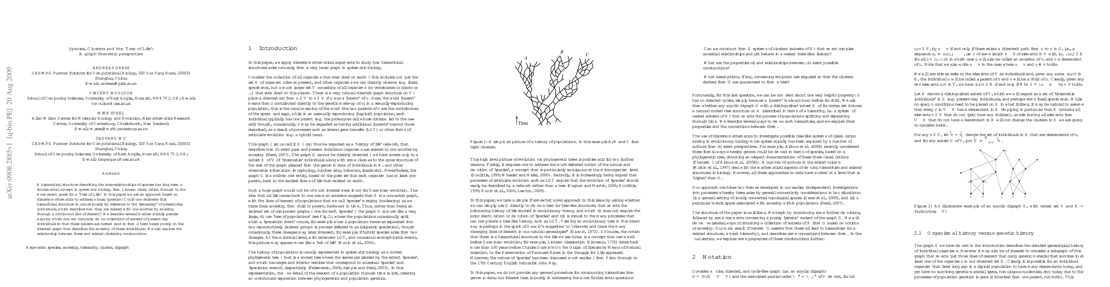 A hierarchical structure describing the inter-relationships of species has long been a fundamental concept in systematic biology, from Linnean classification through to the more recent quest for a 'Tree of Life.' In this paper we use an approach based on discrete mathematics to address a basic question: Could one delineate this hierarchical structure in nature purely by reference to the 'genealogy' of present-day individuals, which describes how they are related with one another by ancestry through a continuous line of descent? We describe several mathematically precise ways by which one can naturally define collections of subsets of present day individuals so that these subsets are nested (and so form a tree) based purely on the directed graph that describes the ancestry of these individuals. We also explore the relationship between these and related clustering constructions.