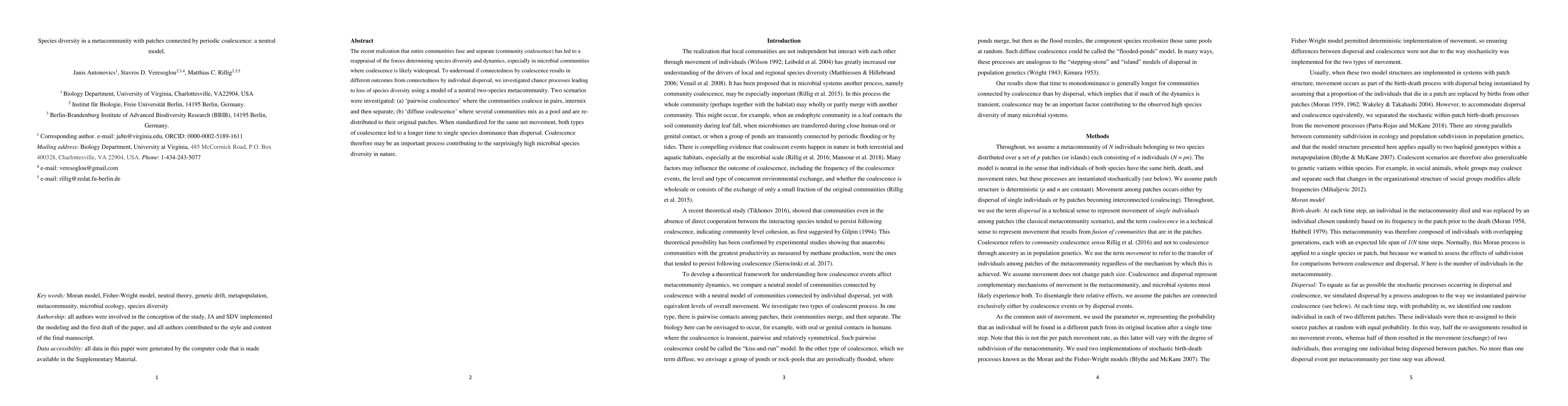 The recent realization that entire communities fuse and separate (community coalescence) has led to a reappraisal of the forces determining species diversity and dynamics, especially in microbial communities where coalescence is likely widespread. To understand if connectedness by coalescence results in different outcomes from connectedness by individual dispersal, we investigated chance processes leading to loss of species diversity using a model of a neutral two-species metacommunity. Two scenarios were investigated: pairwise coalescence where the communities coalesce in pairs, intermix and then separate; and diffuse coalescence where several communities mix as a pool and are re-distributed to their original patches. When standardized for the same net movement, both types of coalescence led to a longer time to single species dominance than dispersal. Coalescence therefore may be an important process contributing to the surprisingly high microbial species diversity in nature.