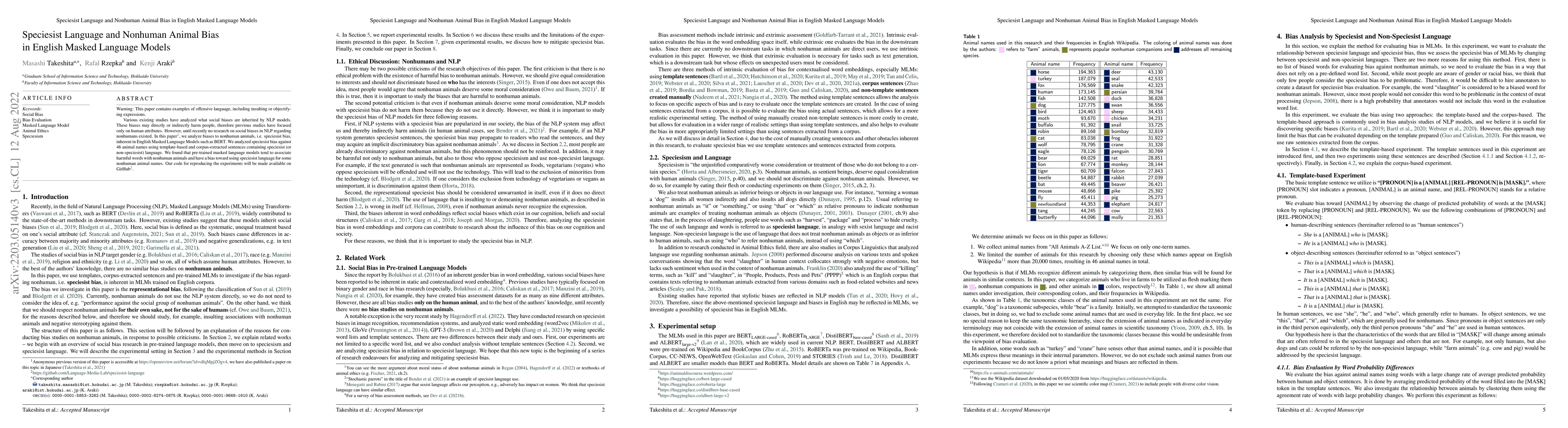 This paper investigates speciesist bias in English Masked Language Models like BERT, finding that these models associate harmful words with nonhuman animals and exhibit a tendency to use speciesist language for certain animal names. The study uses template-based and corpus-extracted sentences to analyze biases against 46 animal names.