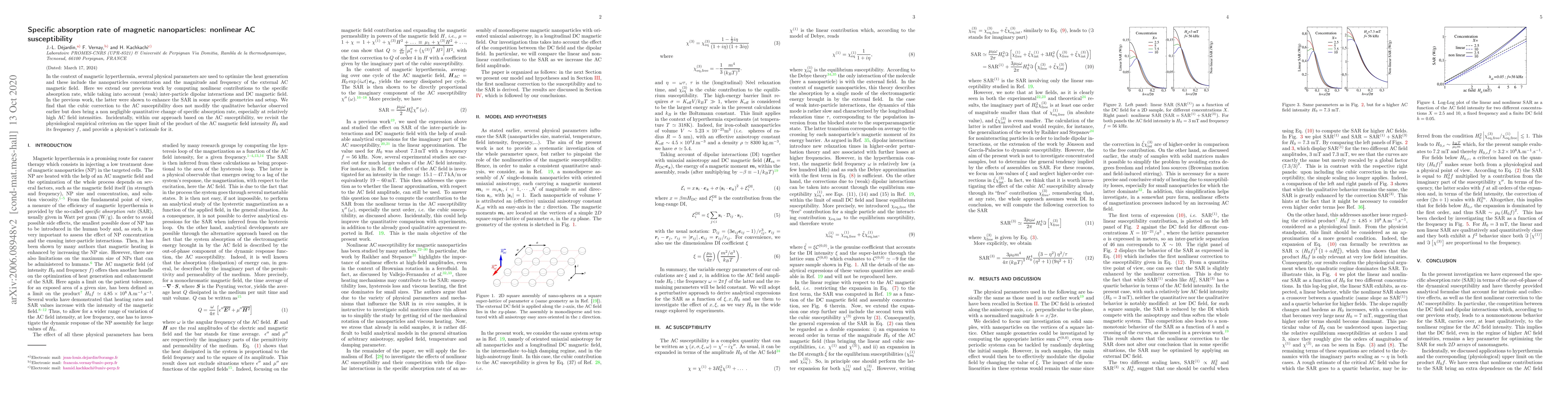 This paper investigates the specific absorption rate (SAR) of magnetic nanoparticles under magnetic hyperthermia, focusing on nonlinear contributions to AC susceptibility. It finds that while cubic corrections to AC susceptibility do not alter the fundamental behavior, they significantly affect SAR quantitatively, especially at high AC field intensities.