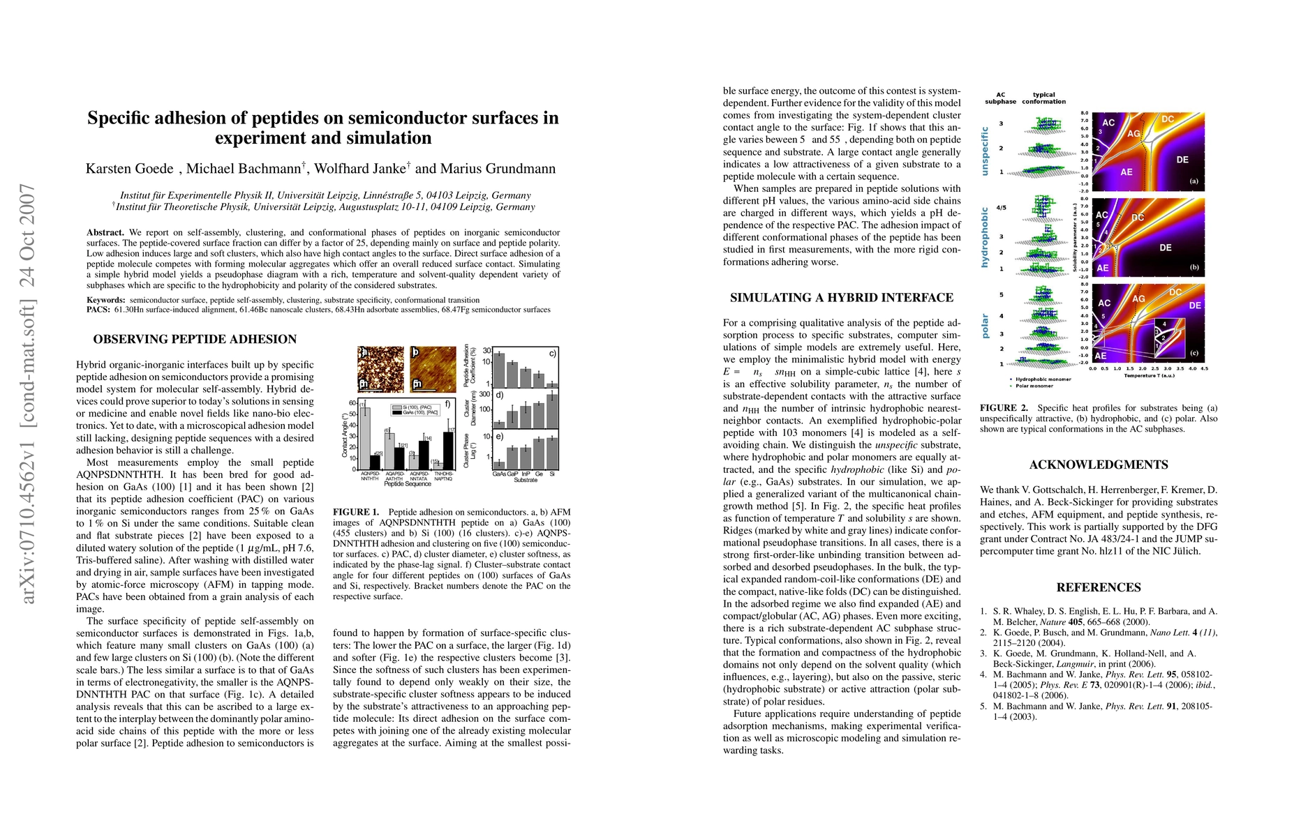 We report on self-assembly, clustering, and conformational phases of peptides on inorganic semiconductor surfaces. The peptide-covered surface fraction can differ by a factor of 25, depending mainly on surface and peptide polarity. Low adhesion induces large and soft clusters, which also have high contact angles to the surface. Direct surface adhesion of a peptide molecule competes with forming molecular aggregates which offer an overall reduced surface contact. Simulating a simple hybrid model yields a pseudophase diagram with a rich, temperature and solvent-quality dependent variety of subphases which are specific to the hydrophobicity and polarity of the considered substrates.