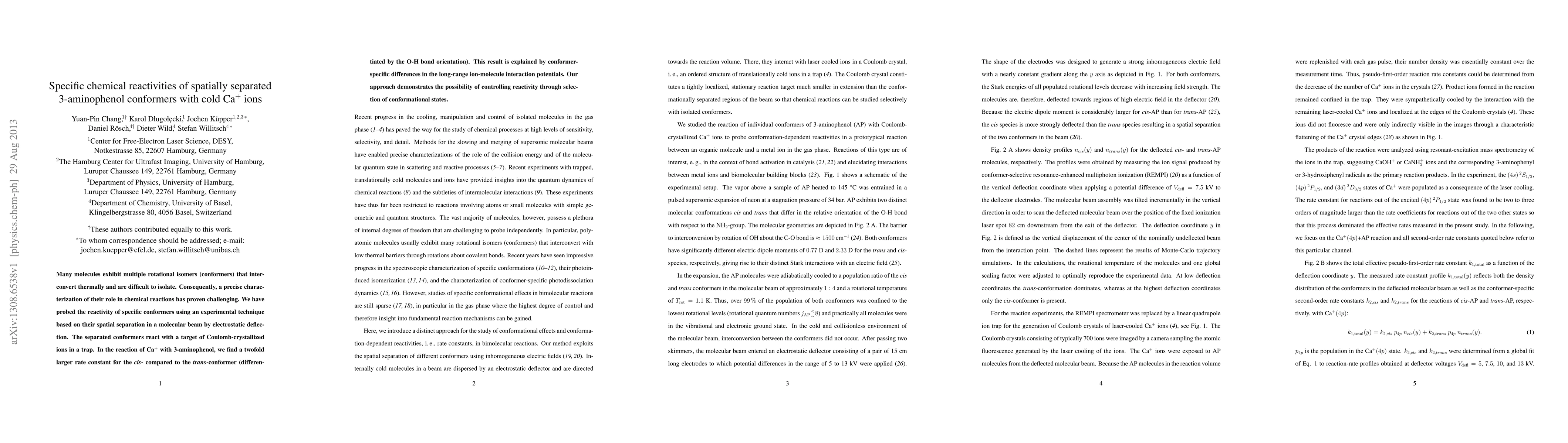 This study investigates the chemical reactivity of spatially separated conformers of 3-aminophenol with cold Ca$^+$ ions using electrostatic deflection in a molecular beam. The findings reveal a twofold higher reaction rate for the \textit{cis}-conformer compared to the \textit{trans}-conformer, attributed to differences in their long-range interaction potentials, showcasing the potential to control reactivity via conformational selection.