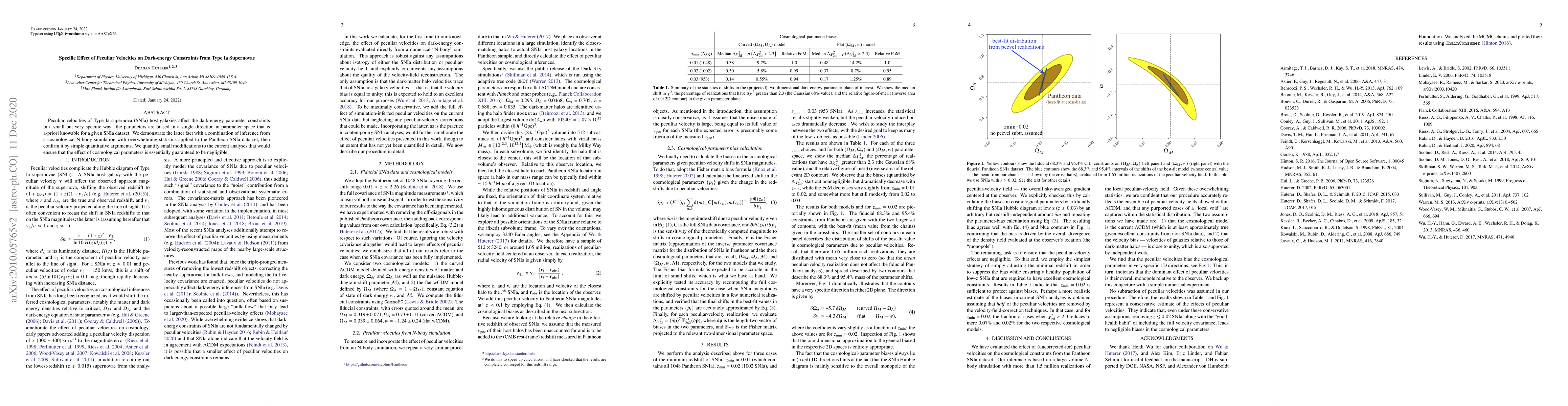 Peculiar velocities of type Ia supernova (SNIa) host galaxies affect the dark-energy parameter constraints in a small but very specific way: the parameters are biased in a single direction in parameter space that is a-priori knowable for a given SNIa dataset. We demonstrate the latter fact with a combination of inference from a cosmological N-body simulation with overwhelming statistics applied to the Pantheon SNIa data set, then confirm it by simple quantitative arguments. We quantify small modifications to the current analyses that would ensure that the effect of cosmological parameters is essentially guaranteed to be negligible.