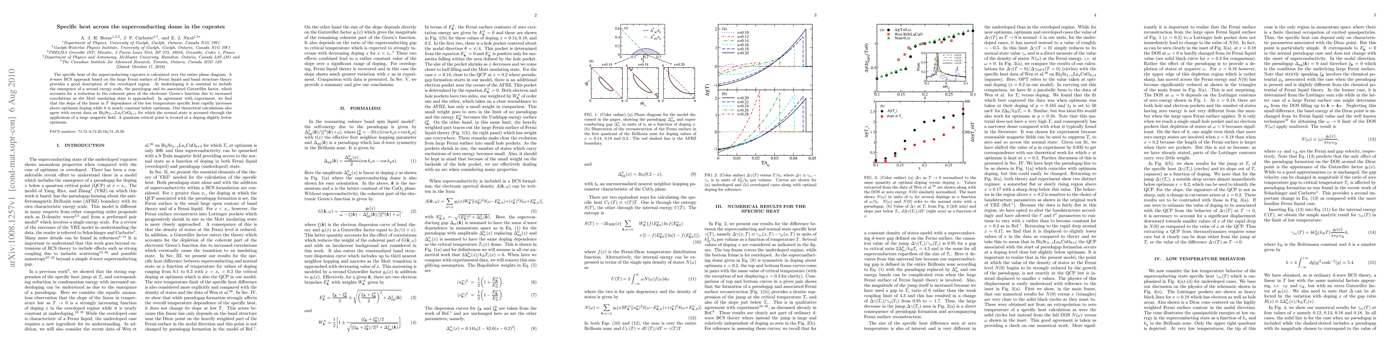 This paper calculates the specific heat across the superconducting dome in cuprates, showing that a d-wave BCS approach fits the overdoped region while pseudogap effects and increased correlations are crucial for underdoped regions. The study finds a rapid increase in the specific heat slope above optimum doping, aligning with experimental observations and recent data on Bi$_2$Sr$_{2-\rm x}$La$_{\rm x}$CuO$_{6+\delta}$.
