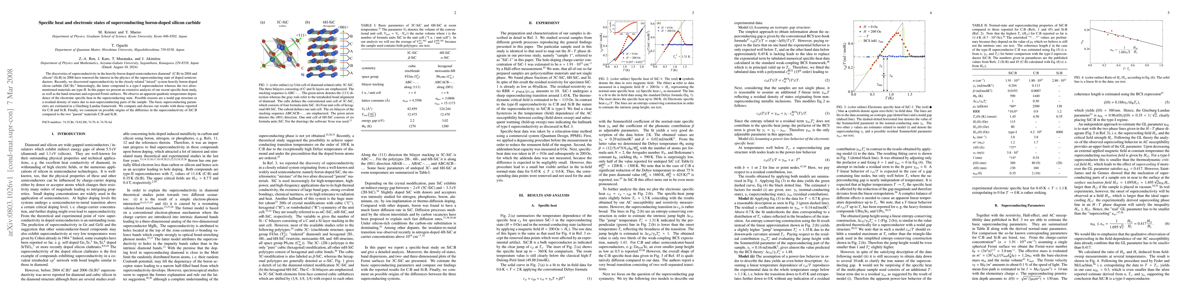 The discoveries of superconductivity in the heavily-boron doped semiconductors diamond (C:B) in 2004 and silicon (Si:B) in 2006 have renewed the interest in the physics of the superconducting state of doped semiconductors. Recently, we discovered superconductivity in the closely related ''mixed'' system heavily boron-doped silcon carbide (SiC:B). Interestingly, the latter compound is a type-I superconductor whereas the two aforementioned materials are type-II. In this paper we present an extensive analysis of our recent specific-heat study, as well as the band structure and expected Fermi surfaces. We observe an apparent quadratic temperature dependence of the electronic specific heat in the superconducting state. Possible reasons are a nodal gap structure or a residual density of states due to non-superconducting parts of the sample. The basic superconducting parameters are estimated in a Ginzburg-Landau framework. We compare and discuss our results with those reported for C:B and Si:B. Finally, we comment on possible origins of the difference in the superconductivity of SiC:B compared to the two ''parent'' materials C:B and Si:B.