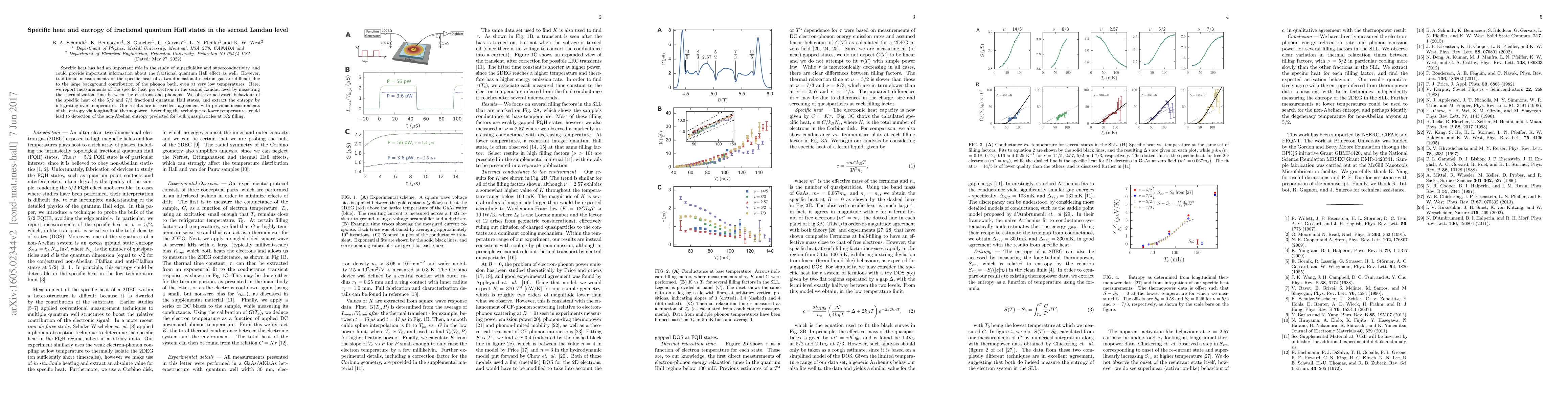 Specific heat has had an important role in the study of superfluidity and superconductivity, and could provide important information about the fractional quantum Hall effect as well. However, traditional measurements of the specific heat of a two-dimensional electron gas are difficult due to the large background contribution of the phonon bath, even at very low temperatures. Here, we report measurements of the specific heat per electron in the second Landau level by measuring the thermalization time between the electrons and phonons. We observe activated behaviour of the specific heat of the 5/2 and 7/3 fractional quantum Hall states, and extract the entropy by integrating over temperature. Our results are in excellent agreement with previous measurements of the entropy via longitudinal thermopower. Extending the technique to lower temperatures could lead to detection of the non-Abelian entropy predicted for bulk quasiparticles at 5/2 filling