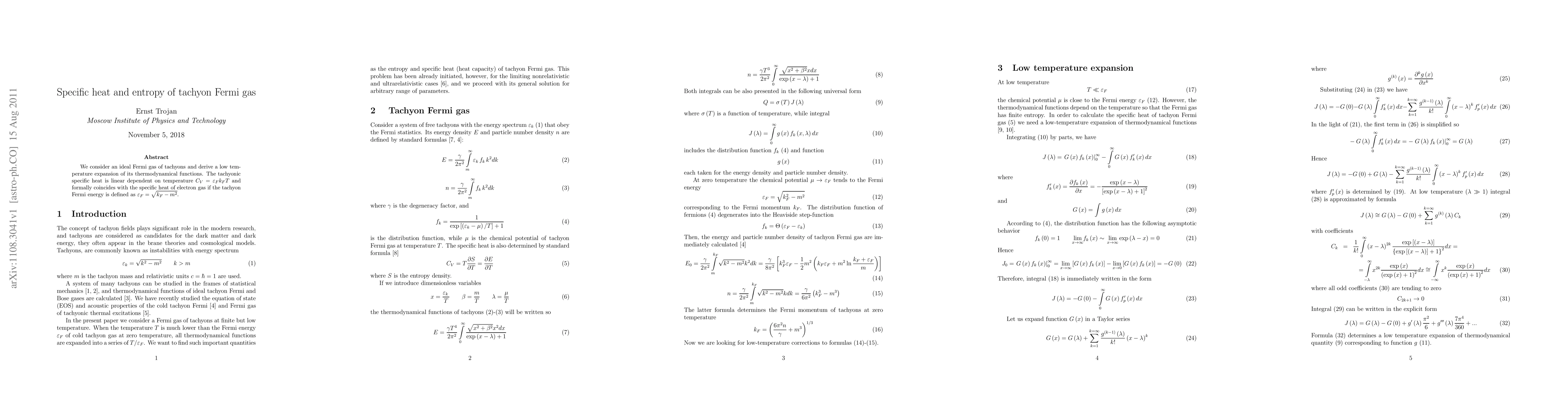 We consider an ideal Fermi gas of tachyons and derive a low temperature expansion of its thermodynamical functions. The tachyonic specific heat is linear dependent on temperature $C_V=\epsilon_Fk_FT$ and formally coincides with the specific heat of electron gas if the tachyon Fermi energy is defined as $\epsilon_F=\sqrt{k_F-m^2}$.