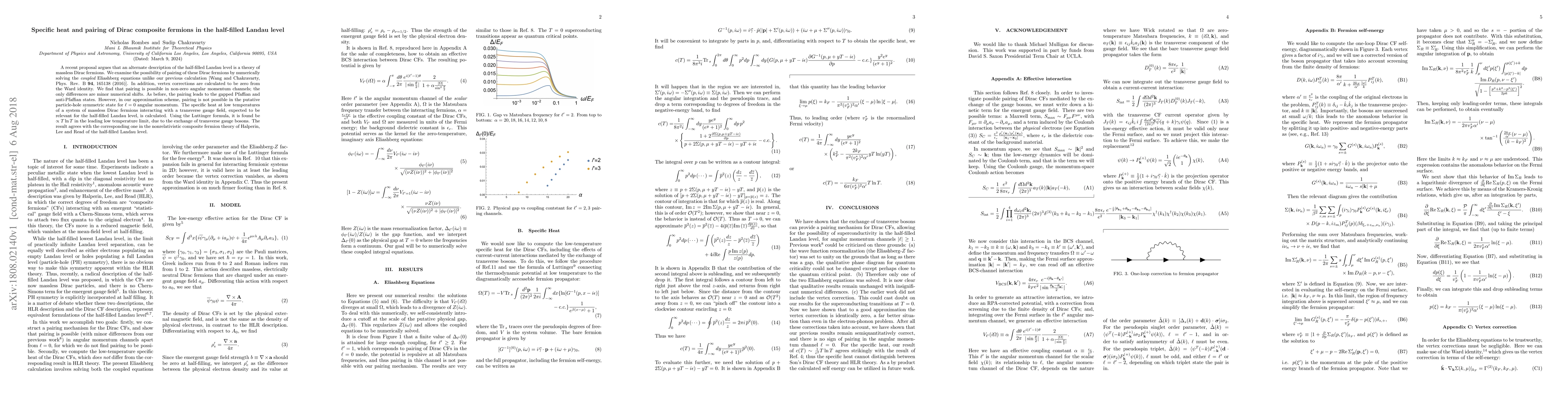 A recent proposal argues that an alternate description of the half-filled Landau level is a theory of massless Dirac fermions. We examine the possibility of pairing of these Dirac fermions by numerically solving the {\em coupled} Eliashberg equations unlike our previous calculation [Wang and Chakravarty, Phys. Rev. B {\bf 94}, 165138 (2016)]. In addition, vertex corrections are calculated to be zero from the Ward identity. We find that pairing is possible in non-zero angular momentum channels; the only differences are minor numerical shifts. As before, the pairing leads to the gapped Pfaffian and anti-Pfaffian states. However, in our approximation scheme, pairing is not possible in the putative particle-hole symmetric state for $\ell=0$ angular momentum. The specific heat at low temperatures of a system of massless Dirac fermions interacting with a transverse gauge field, expected to be relevant for the half-filled Landau level, is calculated. Using the Luttinger formula, it is found be $\propto T\ln T$ in the leading low temperature limit, due to the exchange of transverse gauge bosons. The result agrees with the corresponding one in the nonrelativistic composite fermion theory of Halperin, Lee and Read of the half-filled Landau level.