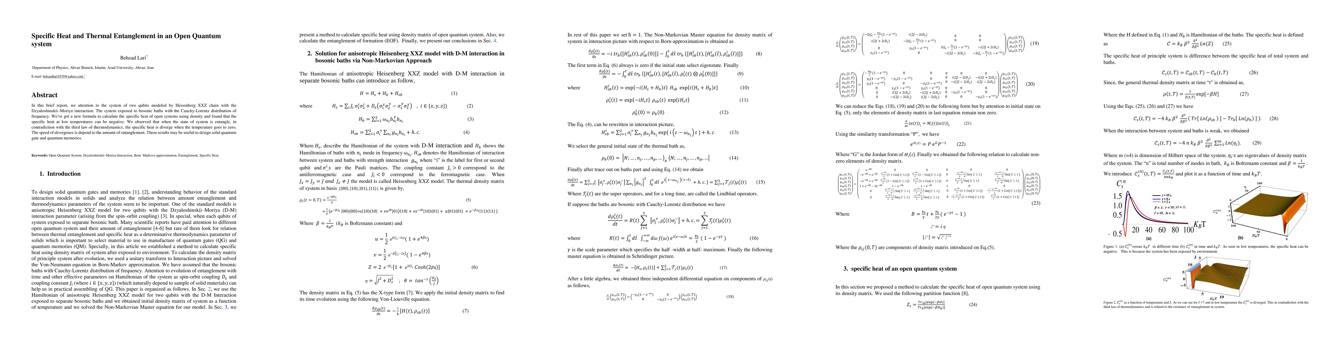 In this brief report, we attention to the system of two qubits modeled by Heisenberg XXZ chain with the Dzyaloshinskii Moriya interaction. The system exposed to bosonic baths with the Cauchy Lorentz distribution of frequency. We've got a new formula to calculate the specific heat of open systems using density and found that the specific heat at low temperatures can be negative. We observed that when the state of system is entangle, in contradiction with the third law of thermodynamics, the specific heat is diverge when the temperature goes to zero. The speed of divergence is depend to the amount of entanglement. These results may be useful to design solid quantum gate and quantum memories.