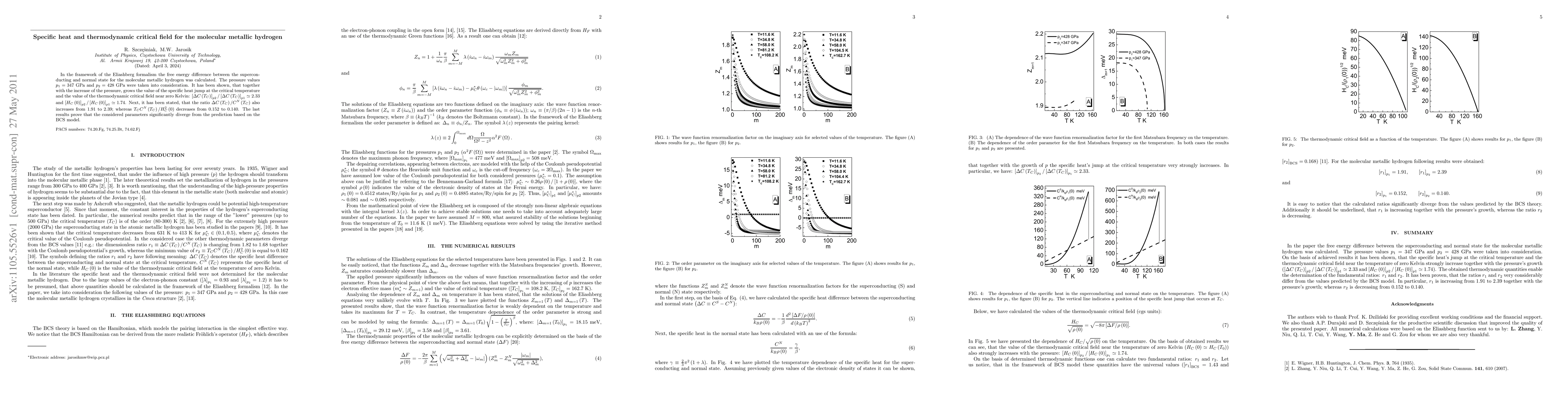 In the framework of the Eliashberg formalism the free energy difference between the superconducting and normal state for the molecular metallic hydrogen was calculated. The pressure values $p_{1}=347$ GPa and $p_{2}=428$ GPa were taken into consideration. It has been shown, that together with the increase of the pressure, grows the value of the specific heat jump at the critical temperature and the value of the thermodynamic critical field near zero Kelvin: $[\Delta C(T_{C})]_{p2}/[\Delta C(T_{C})]_{p1}\simeq 2.33$ and $[H_{C}(0)]_{p2}/[H_{C}(0)]_{p1}\simeq 1.74$. Next, it has been stated, that the ratio $\Delta C(T_{C})/C^{N}(T_{C})$ also increases from 1.91 to 2.39; whereas $T_{C}C^{N}(T_{C})/H^{2}_{C}(0)$ decreases from 0.152 to 0.140. The last results prove that the considered parameters significantly diverge from the prediction based on the BCS model.