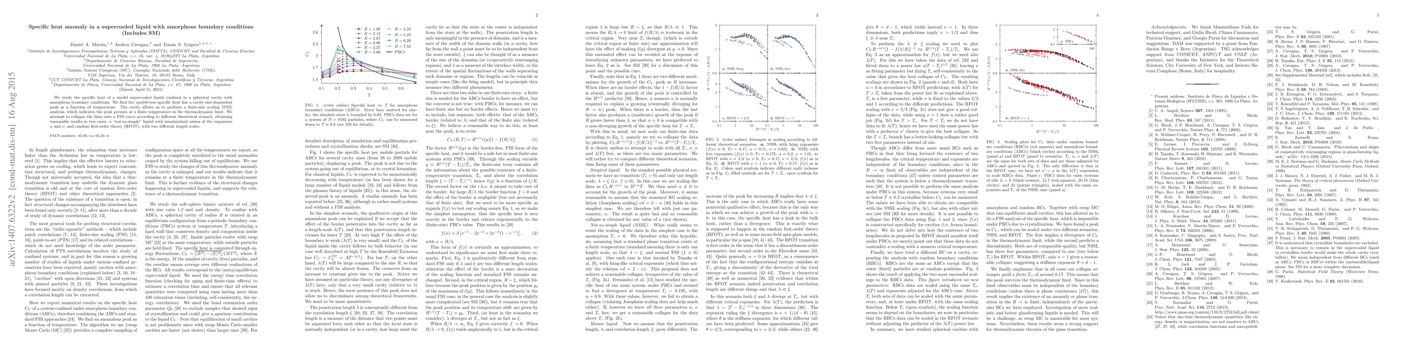 This paper investigates the specific heat anomaly in a supercooled liquid confined within a spherical cavity with amorphous boundaries, revealing a cavity-size-dependent peak. Finite-size scaling analysis suggests the peak persists in the thermodynamic limit, with reasonable fits obtained under two theoretical models: a "not-so-simple" liquid and random first-order theory.