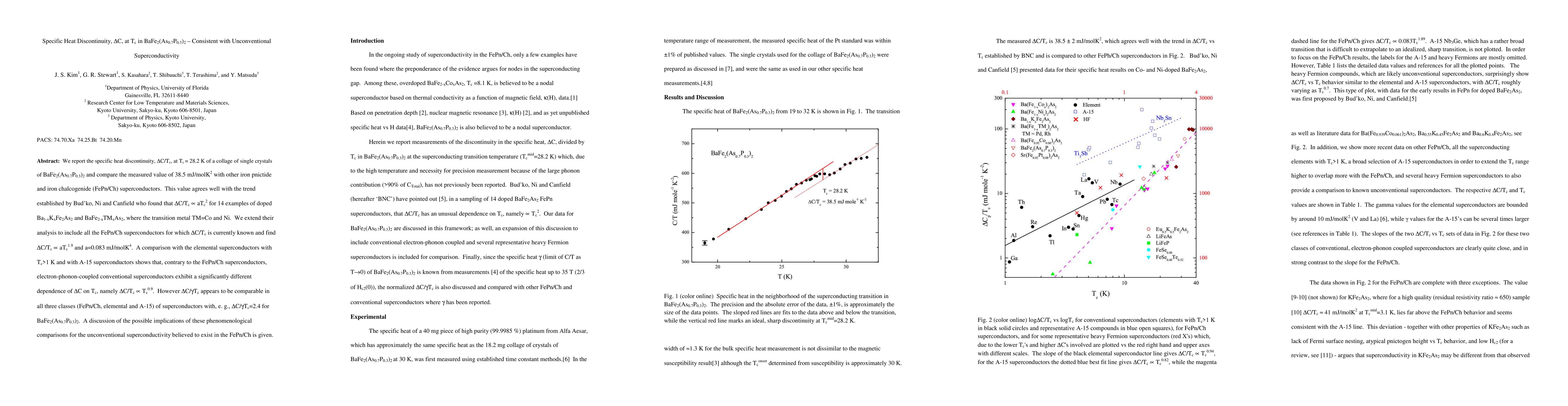 We report the specific heat discontinuity, deltaC/Tc, at Tc = 28.2 K of a collage of single crystals of BaFe2(As0.7P0.3)2 and compare the measured value of 38.5 mJ/molK**2 with other iron pnictide and iron chalcogenide (FePn/Ch) superconductors. This value agrees well with the trend established by Bud'ko, Ni and Canfield who found that deltaC/Tc ~ a*Tc**2 for 14 examples of doped Ba1-xKxFe2As2 and BaFe2-xTMxAs2, where the transition metal TM=Co and Ni. We extend their analysis to include all the FePn/Ch superconductors for which deltaC/Tc is currently known and find deltaC/Tc ~ a*Tc**1.9 and a=0.083 mJ/molK**4. A comparison with the elemental superconductors with Tc>1 K and with A-15 superconductors shows that, contrary to the FePn/Ch superconductors, electron-phonon-coupled conventional superconductors exhibit a significantly different dependence of deltaC on Tc, namely deltaC/Tc ~ Tc**0.9. However deltaC/gamma*Tc appears to be comparable in all three classes (FePn/Ch, elemental and A-15) of superconductors with, e. g., deltaC/gamma*Tc=2.4 for BaFe2(As0.7P0.3)2. A discussion of the possible implications of these phenomenological comparisons for the unconventional superconductivity believed to exist in the FePn/Ch is given.
