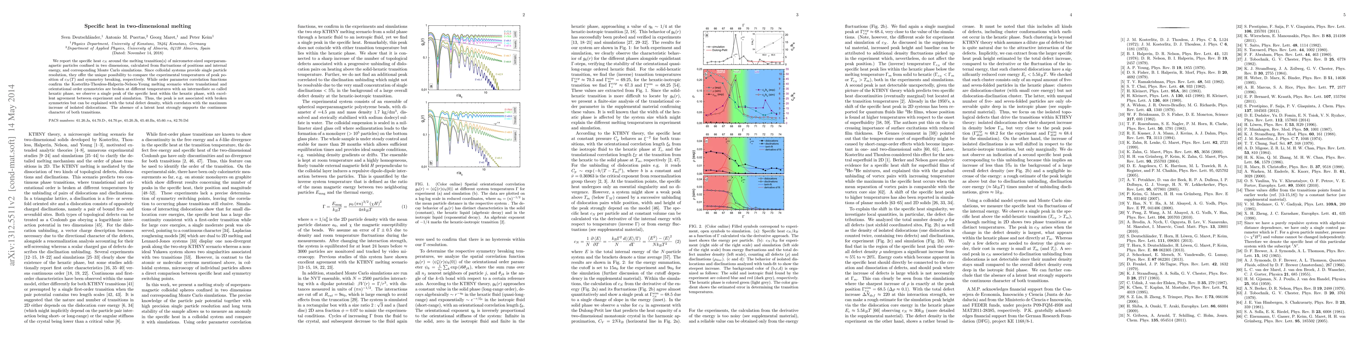 This study investigates the specific heat $c_N$ around the melting transition in two-dimensional superparamagnetic particles, revealing a single peak within the hexatic phase. Experimental and simulation results show that this peak correlates with the density of defects, rather than symmetry breaking, supporting the continuous nature of the melting transitions.